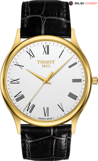 Совершенство среди золотых часов. Тонкий корпус идеально прилегает к запястью. Белый циферблат с римскими цифрами.