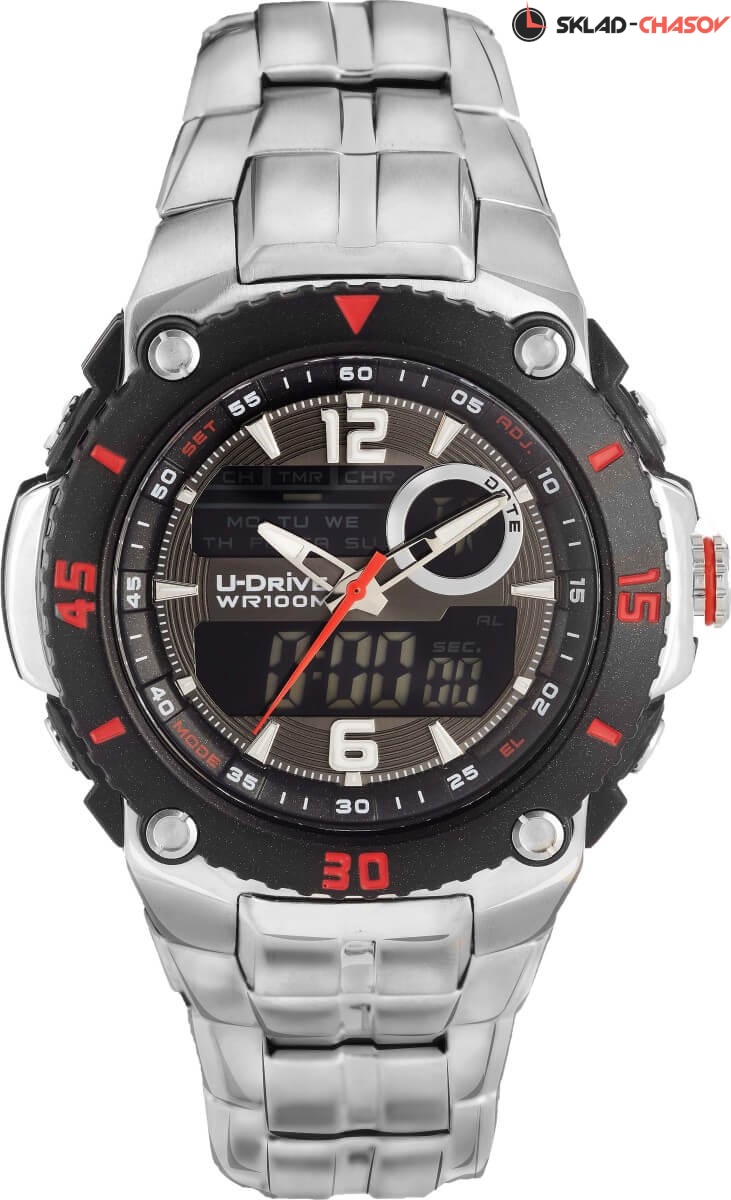 Часы U-Drive – надежный спутник активных и энергичных, тех, кто выбирает экстрим и свободу. Поэтому водостойкость модели повышенная — 10 атмосфер, а задняя крышка закреплена на винтах. В часах можно плавать и заниматься водными видами спорта. Во время тренировок, походов с палатками или в клуб, просто на прогулке с друзьями — часы U-Drive везде будут уместны. Их дизайн легко сочетается со спортивной формой или любой другой повседневной одеждой.