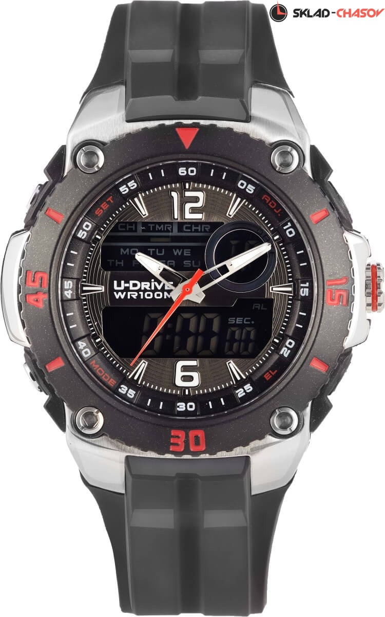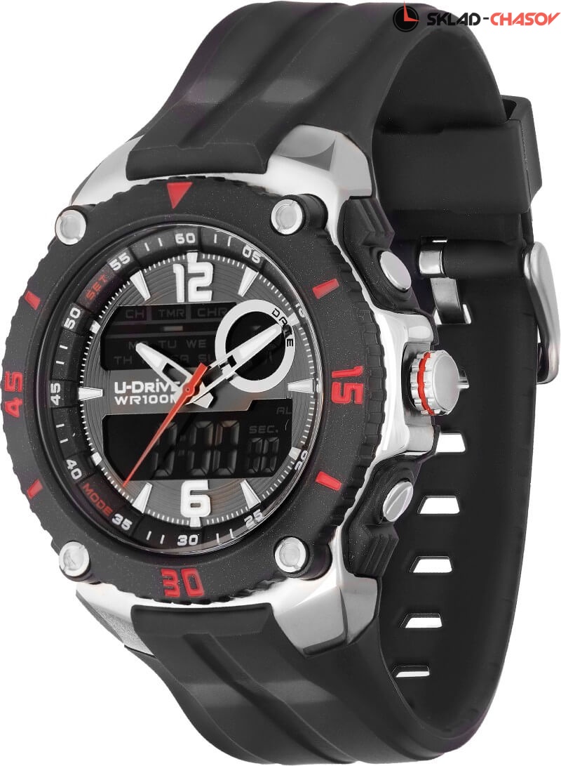Часы U-Drive – надежный спутник активных и энергичных, тех, кто выбирает экстрим и свободу. Поэтому водостойкость модели повышенная — 10 атмосфер, а задняя крышка закреплена на винтах. В часах можно плавать и заниматься водными видами спорта. Во время тренировок, походов с палатками или в клуб, просто на прогулке с друзьями — часы U-Drive везде будут уместны. Их дизайн легко сочетается со спортивной формой или любой другой повседневной одеждой.