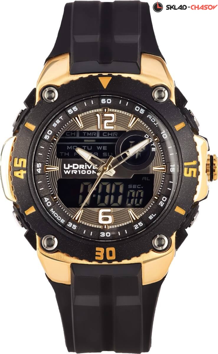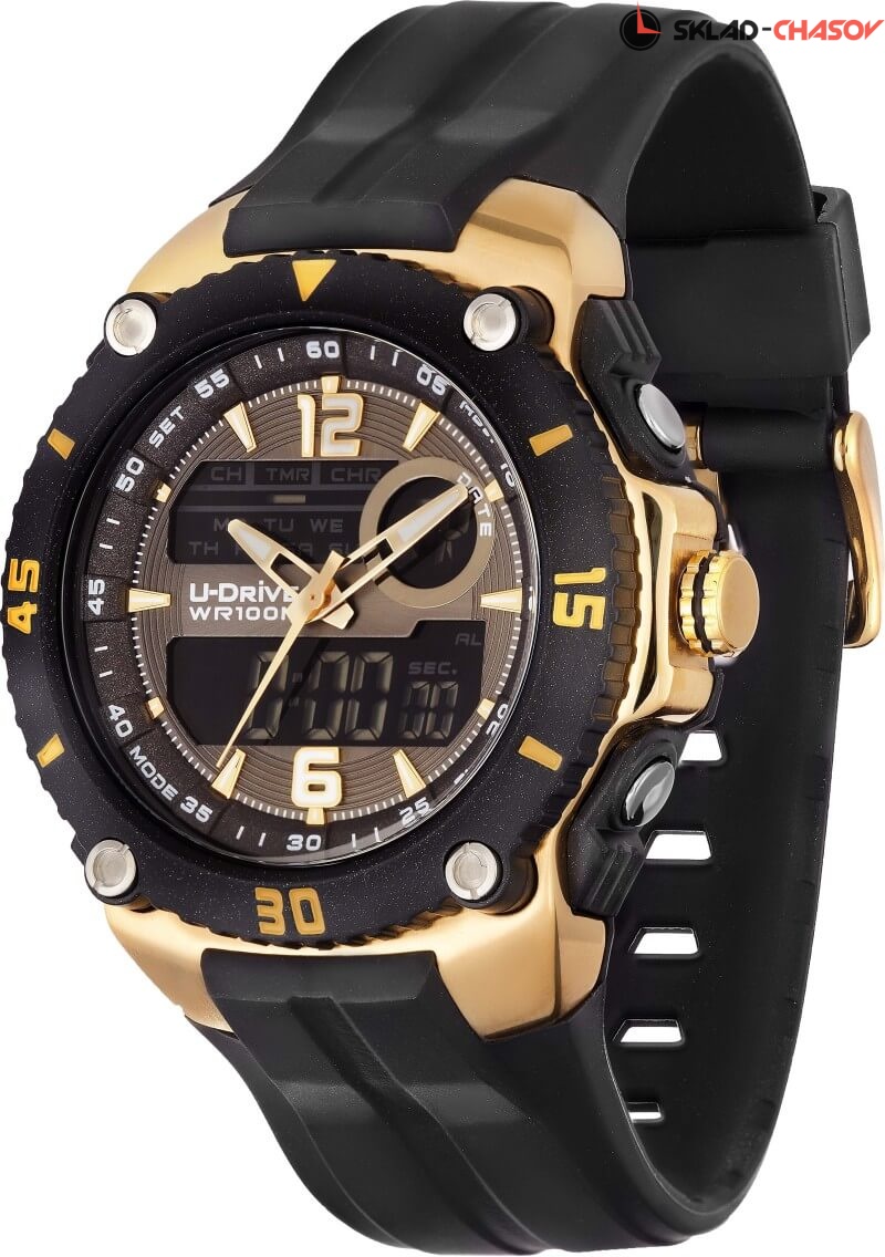 Часы U-Drive – надежный спутник активных и энергичных, тех, кто выбирает экстрим и свободу. Поэтому водостойкость модели повышенная — 10 атмосфер, а задняя крышка закреплена на винтах. В часах можно плавать и заниматься водными видами спорта. Во время тренировок, походов с палатками или в клуб, просто на прогулке с друзьями — часы U-Drive везде будут уместны. Их дизайн легко сочетается со спортивной формой или любой другой повседневной одеждой.