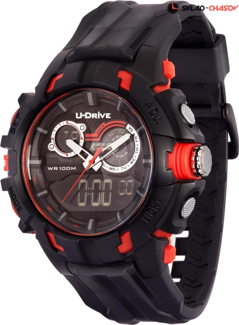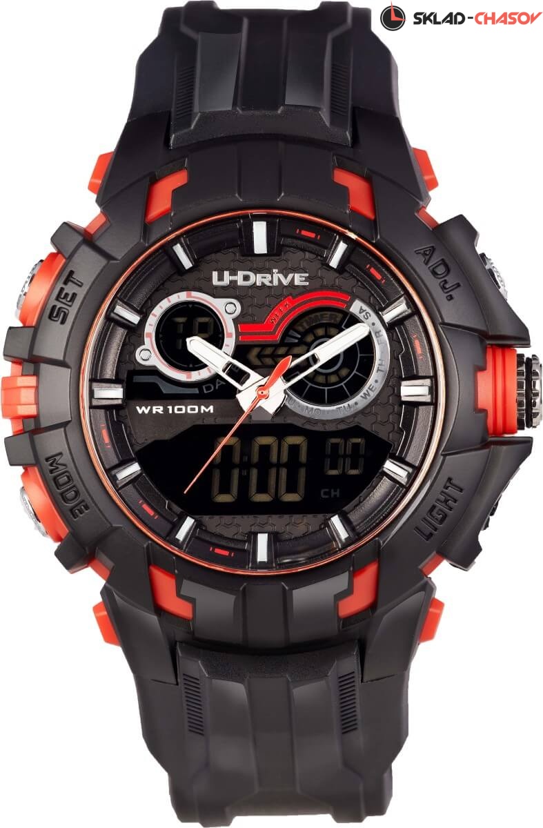 Часы U-Drive – надежный спутник активных и энергичных, тех, кто выбирает экстрим и свободу. Поэтому водостойкость модели повышенная — 10 атмосфер, а задняя крышка закреплена на винтах. В часах можно плавать и заниматься водными видами спорта. Во время тренировок, походов с палатками или в клуб, просто на прогулке с друзьями — часы U-Drive везде будут уместны. Их дизайн легко сочетается со спортивной формой или любой другой повседневной одеждой.