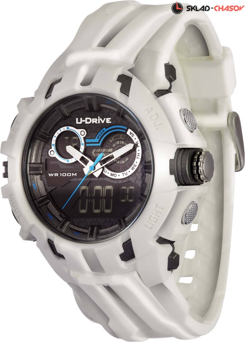 Часы U-Drive – надежный спутник активных и энергичных, тех, кто выбирает экстрим и свободу. Поэтому водостойкость модели повышенная — 10 атмосфер, а задняя крышка закреплена на винтах. В часах можно плавать и заниматься водными видами спорта. Во время тренировок, походов с палатками или в клуб, просто на прогулке с друзьями — часы U-Drive везде будут уместны. Их дизайн легко сочетается со спортивной формой или любой другой повседневной одеждой.