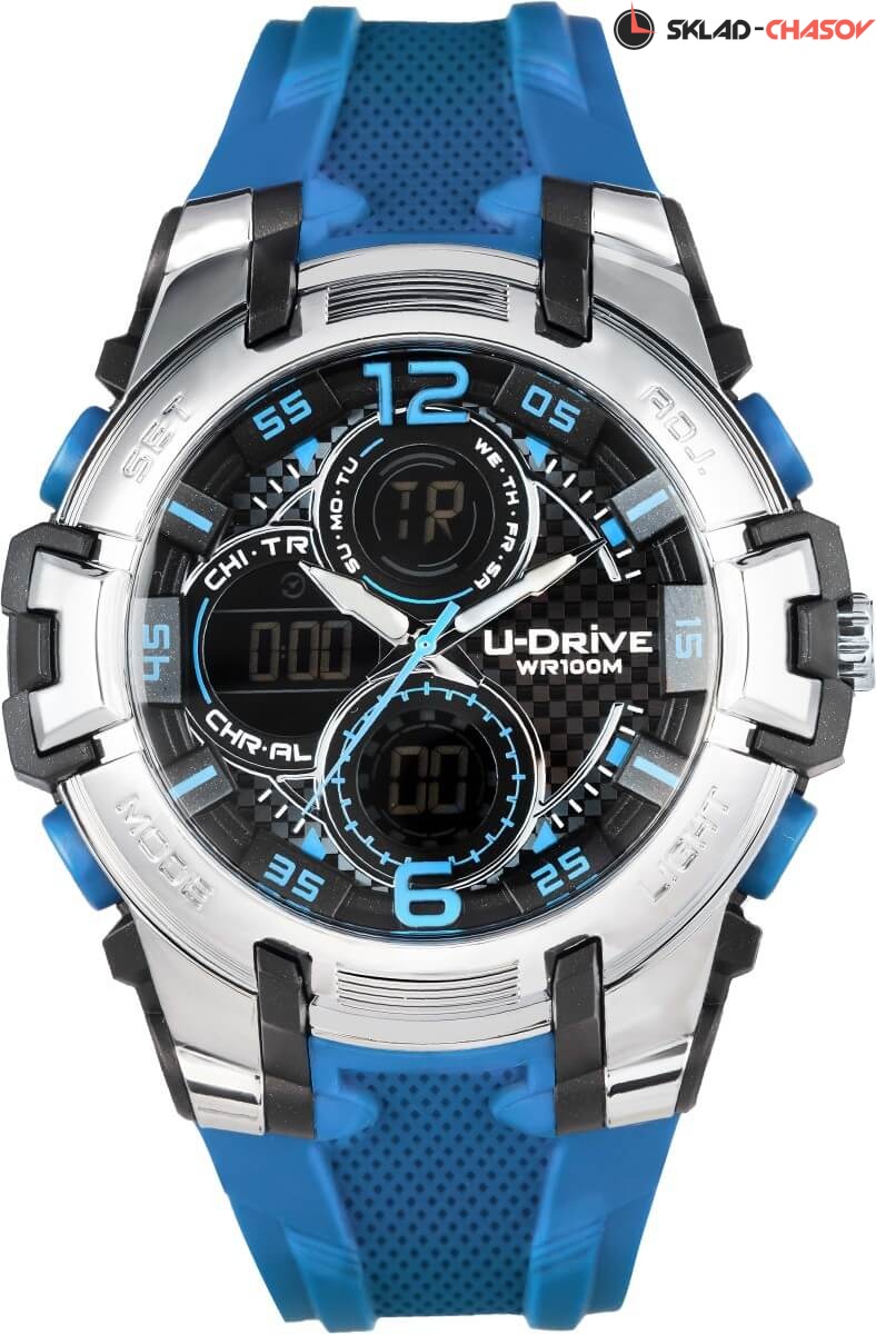 Часы U-Drive – надежный спутник активных и энергичных, тех, кто выбирает экстрим и свободу. Поэтому водостойкость модели повышенная — 10 атмосфер, а задняя крышка закреплена на винтах. В часах можно плавать и заниматься водными видами спорта. Во время тренировок, походов с палатками или в клуб, просто на прогулке с друзьями — часы U-Drive везде будут уместны. Их дизайн легко сочетается со спортивной формой или любой другой повседневной одеждой.