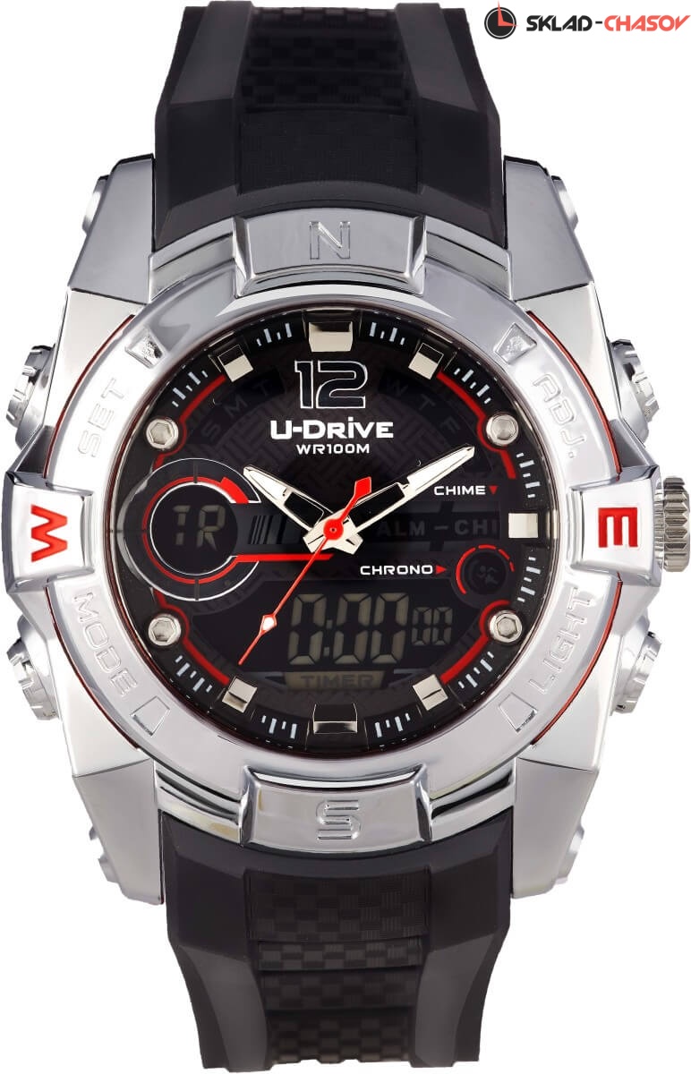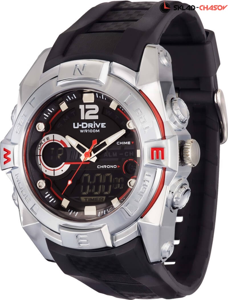 Часы U-Drive – надежный спутник активных и энергичных, тех, кто выбирает экстрим и свободу. Поэтому водостойкость модели повышенная — 10 атмосфер, а задняя крышка закреплена на винтах. В часах можно плавать и заниматься водными видами спорта. Во время тренировок, походов с палатками или в клуб, просто на прогулке с друзьями — часы U-Drive везде будут уместны. Их дизайн легко сочетается со спортивной формой или любой другой повседневной одеждой.