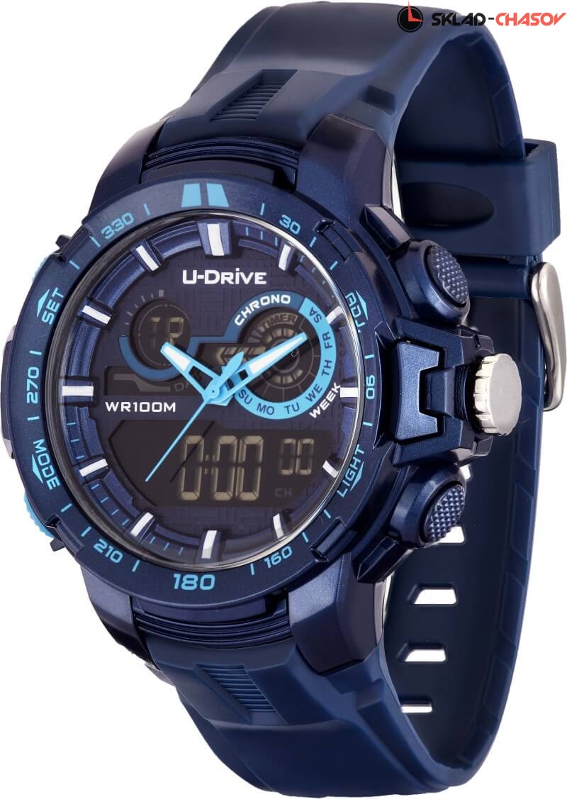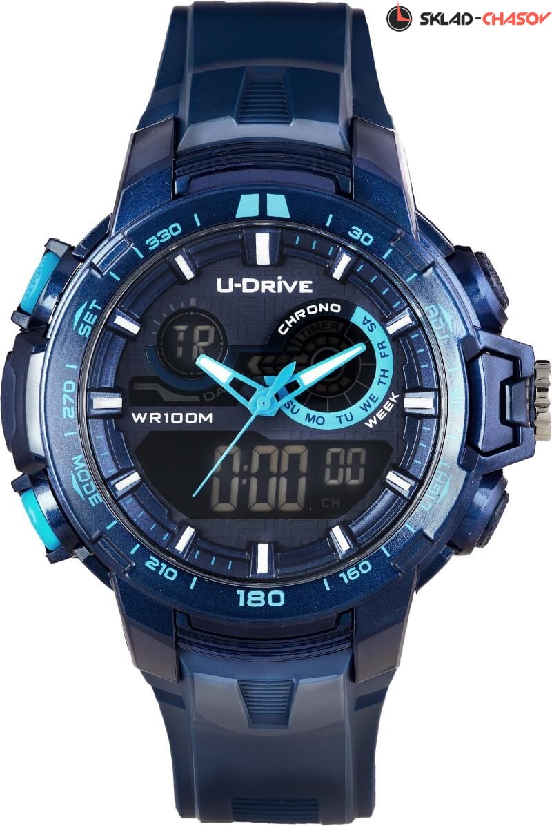 Часы U-Drive – надежный спутник активных и энергичных, тех, кто выбирает экстрим и свободу. Поэтому водостойкость модели повышенная — 10 атмосфер, а задняя крышка закреплена на винтах. В часах можно плавать и заниматься водными видами спорта. Во время тренировок, походов с палатками или в клуб, просто на прогулке с друзьями — часы U-Drive везде будут уместны. Их дизайн легко сочетается со спортивной формой или любой другой повседневной одеждой.