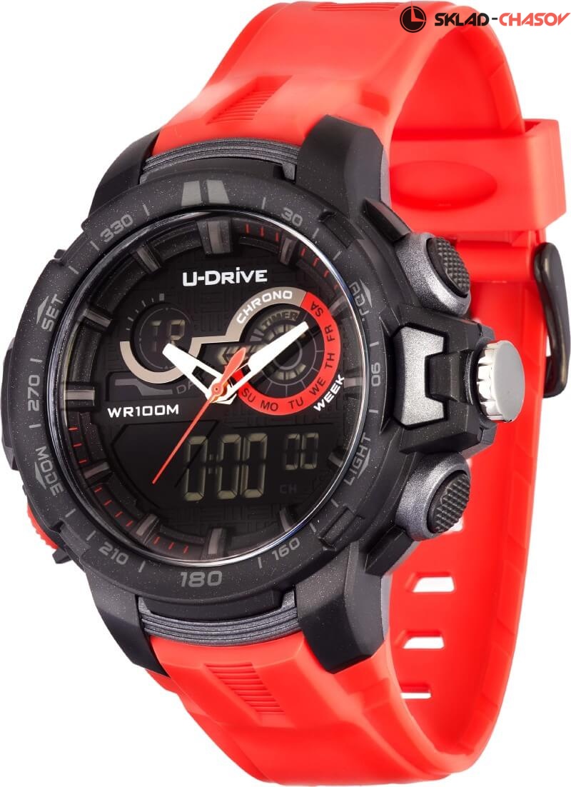 Часы U-Drive – надежный спутник активных и энергичных, тех, кто выбирает экстрим и свободу. Поэтому водостойкость модели повышенная — 10 атмосфер, а задняя крышка закреплена на винтах. В часах можно плавать и заниматься водными видами спорта. Во время тренировок, походов с палатками или в клуб, просто на прогулке с друзьями — часы U-Drive везде будут уместны. Их дизайн легко сочетается со спортивной формой или любой другой повседневной одеждой.