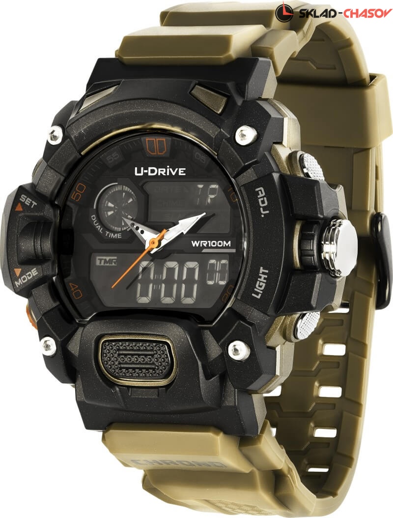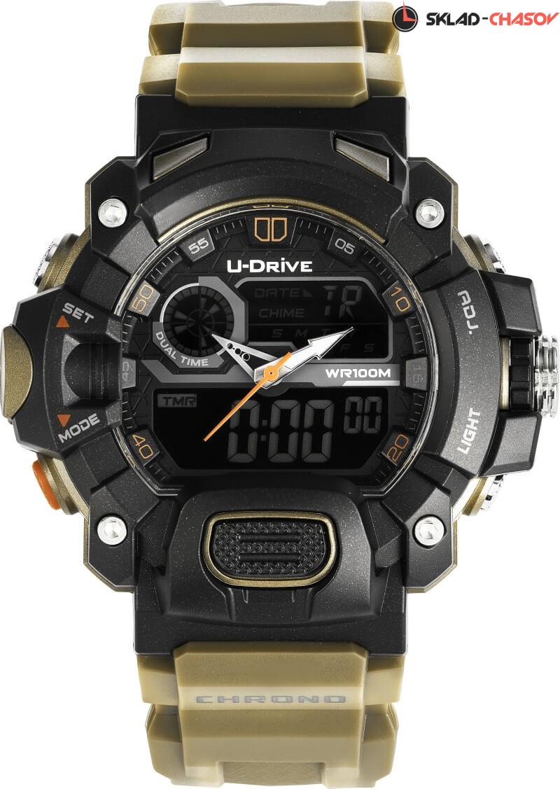 Часы U-Drive – надежный спутник активных и энергичных, тех, кто выбирает экстрим и свободу. Поэтому водостойкость модели повышенная — 10 атмосфер, а задняя крышка закреплена на винтах. В часах можно плавать и заниматься водными видами спорта. Во время тренировок, походов с палатками или в клуб, просто на прогулке с друзьями — часы U-Drive везде будут уместны. Их дизайн легко сочетается со спортивной формой или любой другой повседневной одеждой.