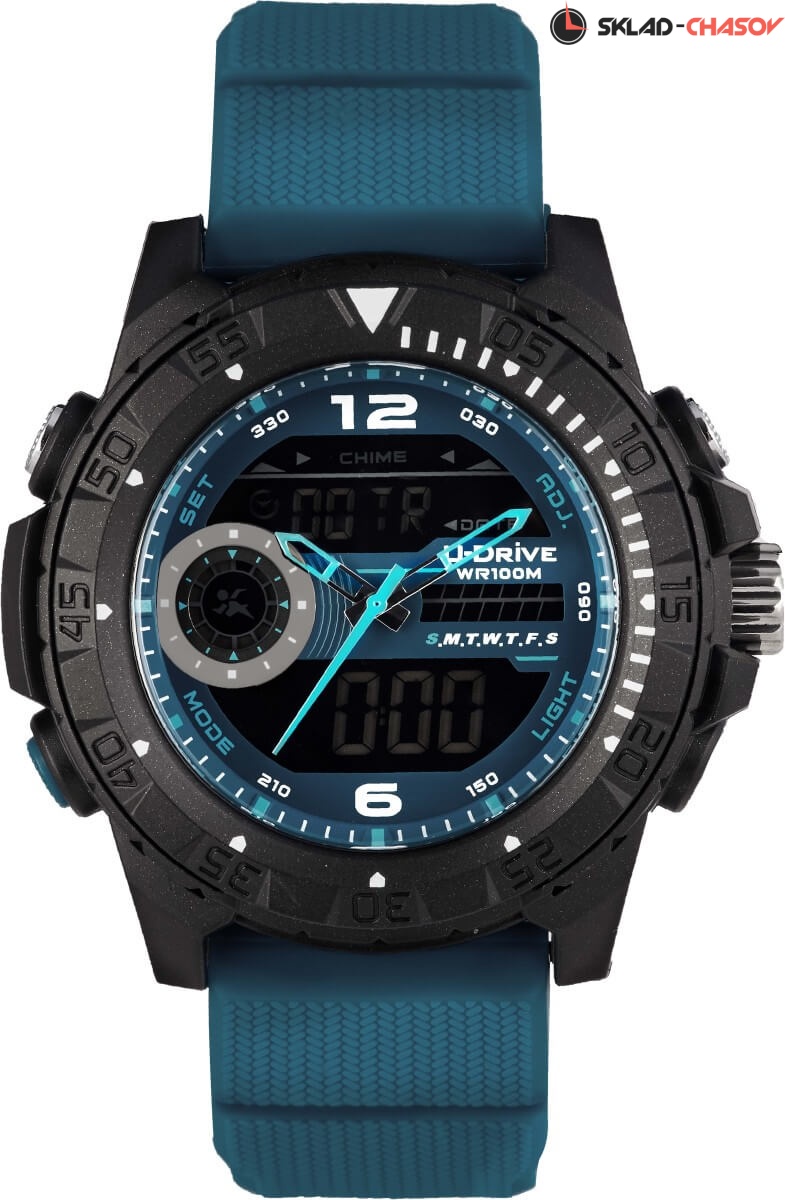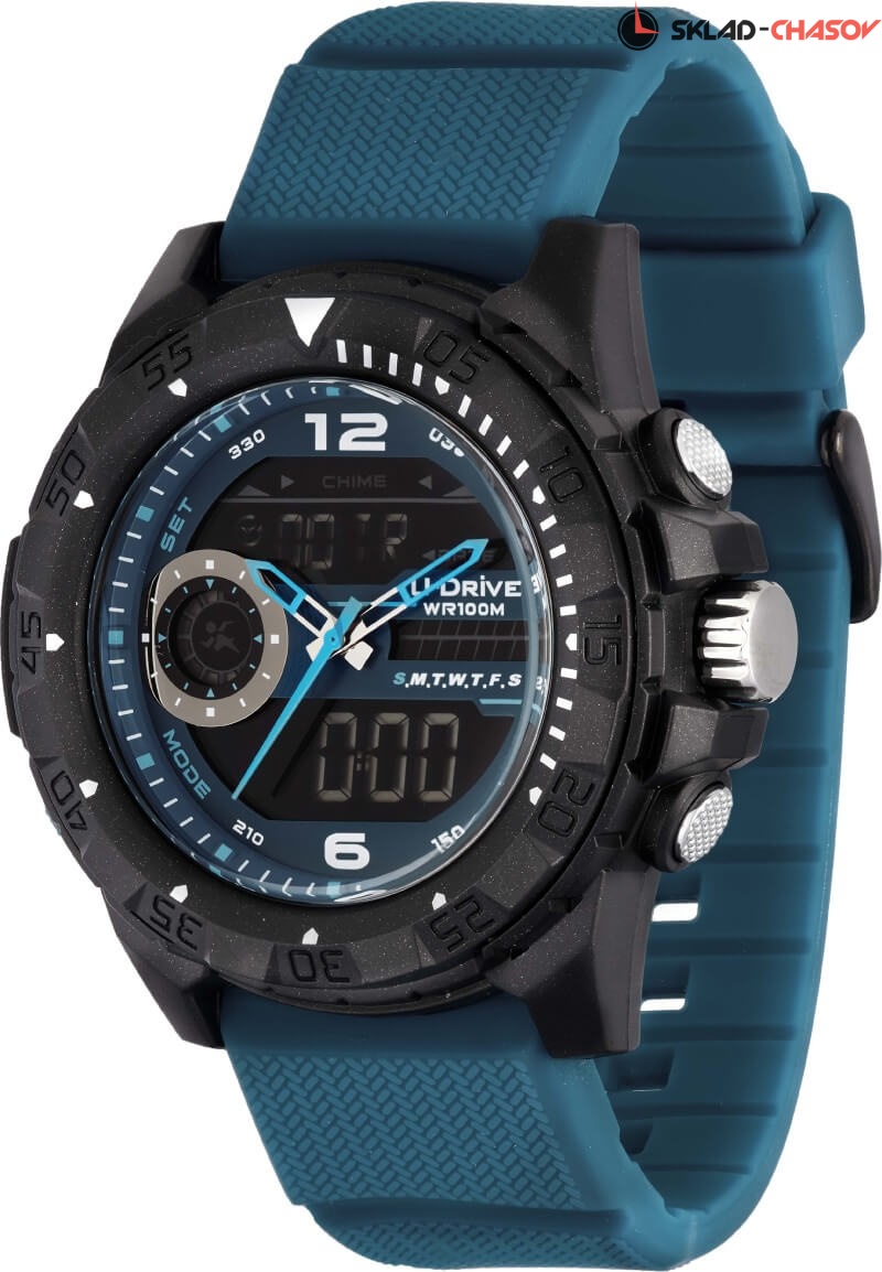 Часы U-Drive – надежный спутник активных и энергичных, тех, кто выбирает экстрим и свободу. Поэтому водостойкость модели повышенная — 10 атмосфер, а задняя крышка закреплена на винтах. В часах можно плавать и заниматься водными видами спорта. Во время тренировок, походов с палатками или в клуб, просто на прогулке с друзьями — часы U-Drive везде будут уместны. Их дизайн легко сочетается со спортивной формой или любой другой повседневной одеждой.