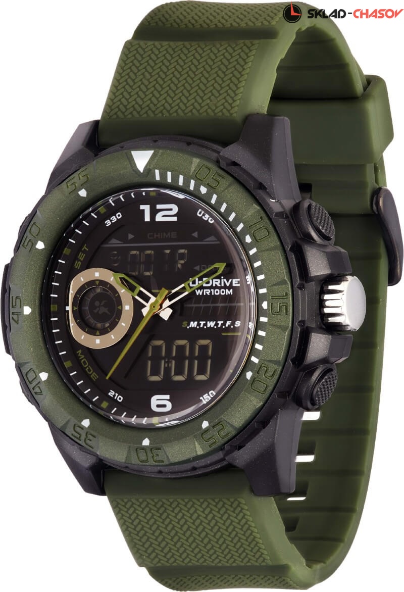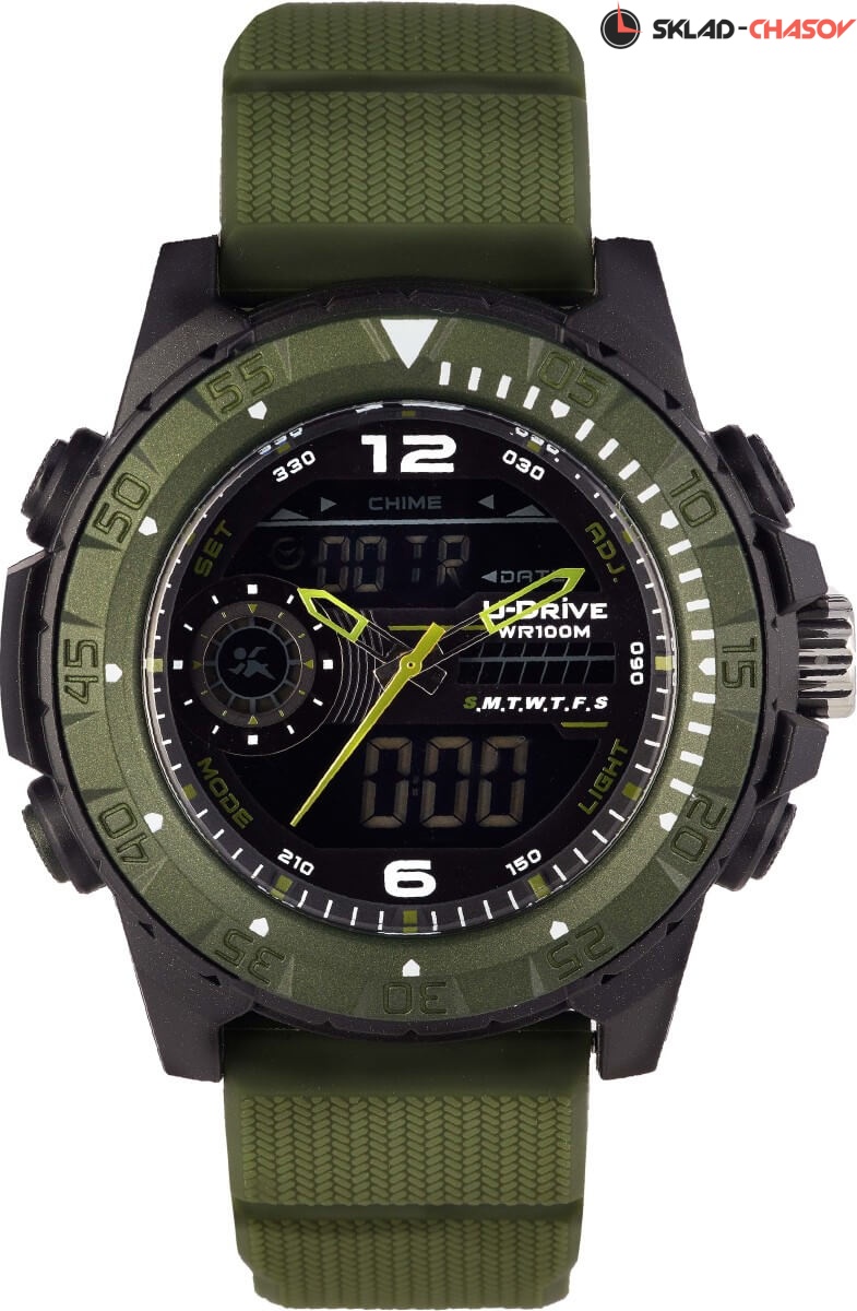 Часы U-Drive – надежный спутник активных и энергичных, тех, кто выбирает экстрим и свободу. Поэтому водостойкость модели повышенная — 10 атмосфер, а задняя крышка закреплена на винтах. В часах можно плавать и заниматься водными видами спорта. Во время тренировок, походов с палатками или в клуб, просто на прогулке с друзьями — часы U-Drive везде будут уместны. Их дизайн легко сочетается со спортивной формой или любой другой повседневной одеждой.