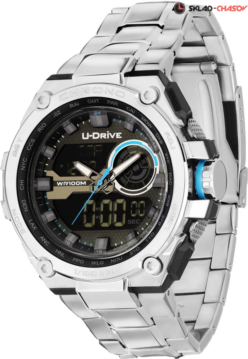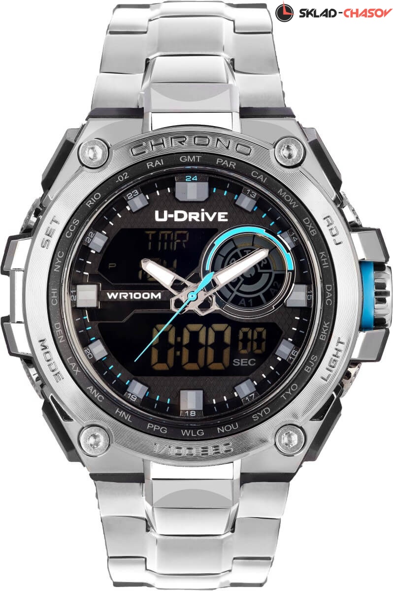 Часы U-Drive – надежный спутник активных и энергичных, тех, кто выбирает экстрим и свободу. Поэтому водостойкость модели повышенная — 10 атмосфер, а задняя крышка закреплена на винтах. В часах можно плавать и заниматься водными видами спорта. Во время тренировок, походов с палатками или в клуб, просто на прогулке с друзьями — часы U-Drive везде будут уместны. Их дизайн легко сочетается со спортивной формой или любой другой повседневной одеждой.