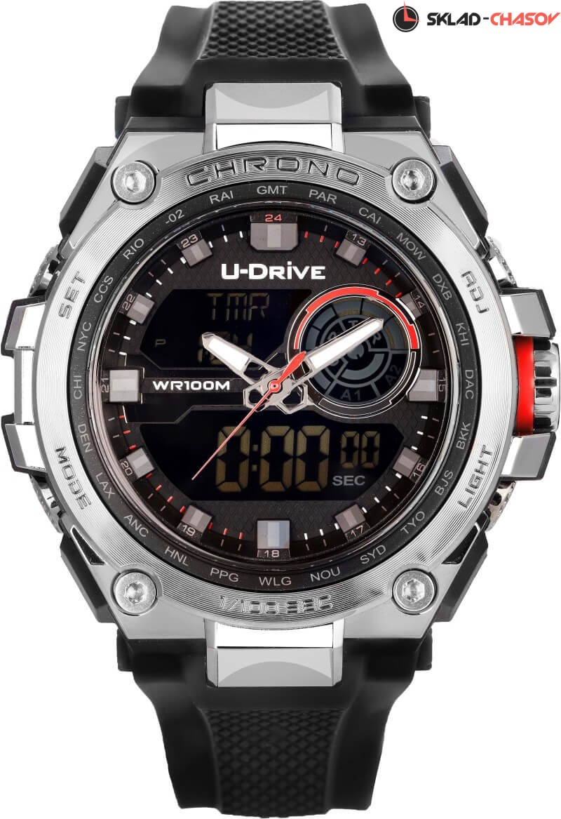 Часы U-Drive – надежный спутник активных и энергичных, тех, кто выбирает экстрим и свободу. Поэтому водостойкость модели повышенная — 10 атмосфер, а задняя крышка закреплена на винтах. В часах можно плавать и заниматься водными видами спорта. Во время тренировок, походов с палатками или в клуб, просто на прогулке с друзьями — часы U-Drive везде будут уместны. Их дизайн легко сочетается со спортивной формой или любой другой повседневной одеждой.