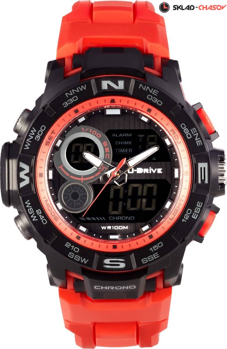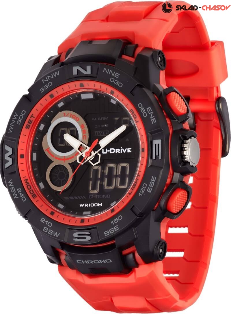 Часы U-Drive – надежный спутник активных и энергичных, тех, кто выбирает экстрим и свободу. Поэтому водостойкость модели повышенная — 10 атмосфер, а задняя крышка закреплена на винтах. В часах можно плавать и заниматься водными видами спорта. Во время тренировок, походов с палатками или в клуб, просто на прогулке с друзьями — часы U-Drive везде будут уместны. Их дизайн легко сочетается со спортивной формой или любой другой повседневной одеждой.