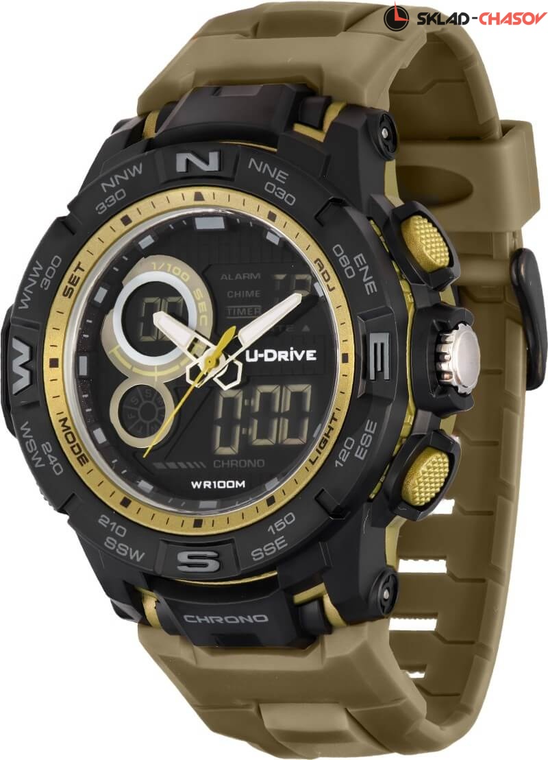 Часы U-Drive – надежный спутник активных и энергичных, тех, кто выбирает экстрим и свободу. Поэтому водостойкость модели повышенная — 10 атмосфер, а задняя крышка закреплена на винтах. В часах можно плавать и заниматься водными видами спорта. Во время тренировок, походов с палатками или в клуб, просто на прогулке с друзьями — часы U-Drive везде будут уместны. Их дизайн легко сочетается со спортивной формой или любой другой повседневной одеждой.