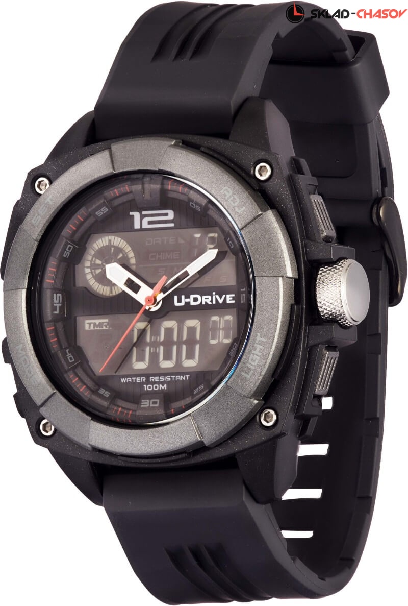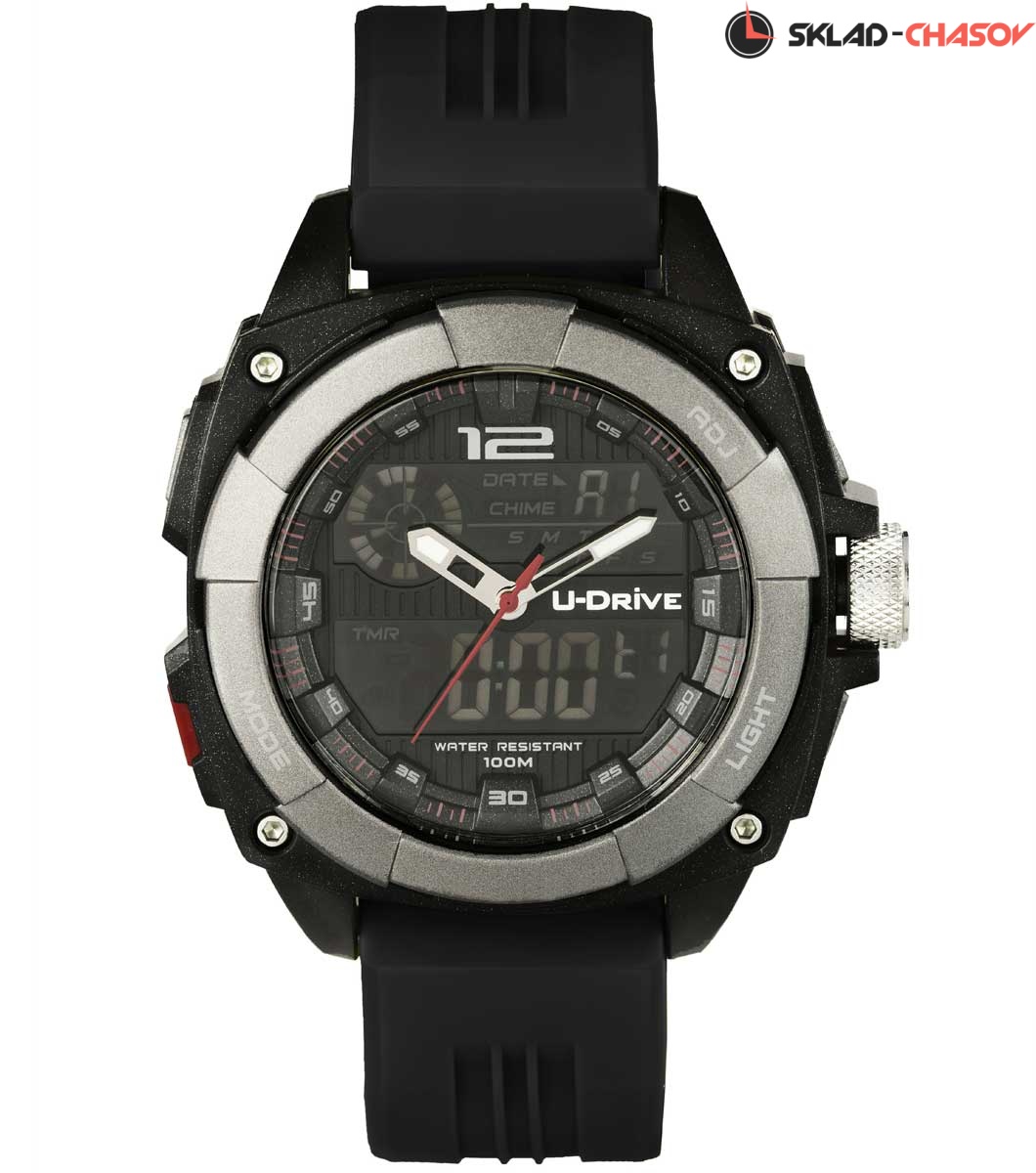 Часы U-Drive – надежный спутник активных и энергичных, тех, кто выбирает экстрим и свободу. Поэтому водостойкость модели повышенная — 10 атмосфер, а задняя крышка закреплена на винтах. В часах можно плавать и заниматься водными видами спорта. Во время тренировок, походов с палатками или в клуб, просто на прогулке с друзьями — часы U-Drive везде будут уместны. Их дизайн легко сочетается со спортивной формой или любой другой повседневной одеждой.