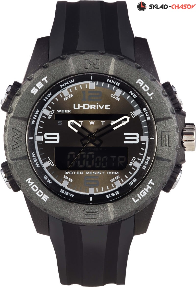 Часы U-Drive – надежный спутник активных и энергичных, тех, кто выбирает экстрим и свободу. Поэтому водостойкость модели повышенная — 10 атмосфер, а задняя крышка закреплена на винтах. В часах можно плавать и заниматься водными видами спорта. Во время тренировок, походов с палатками или в клуб, просто на прогулке с друзьями — часы U-Drive везде будут уместны. Их дизайн легко сочетается со спортивной формой или любой другой повседневной одеждой.