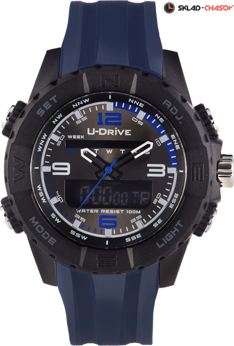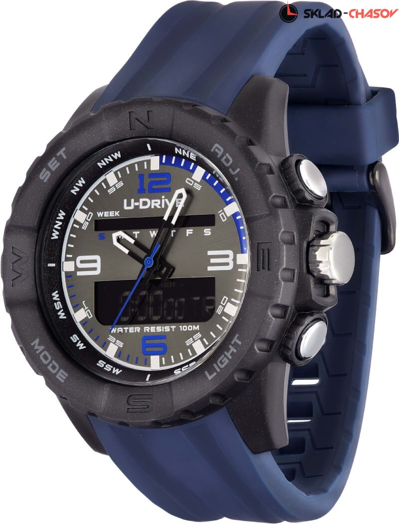 Часы U-Drive – надежный спутник активных и энергичных, тех, кто выбирает экстрим и свободу. Поэтому водостойкость модели повышенная — 10 атмосфер, а задняя крышка закреплена на винтах. В часах можно плавать и заниматься водными видами спорта. Во время тренировок, походов с палатками или в клуб, просто на прогулке с друзьями — часы U-Drive везде будут уместны. Их дизайн легко сочетается со спортивной формой или любой другой повседневной одеждой.
