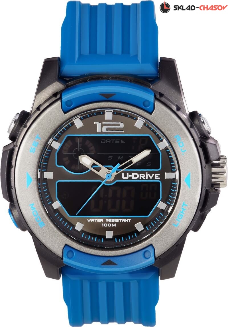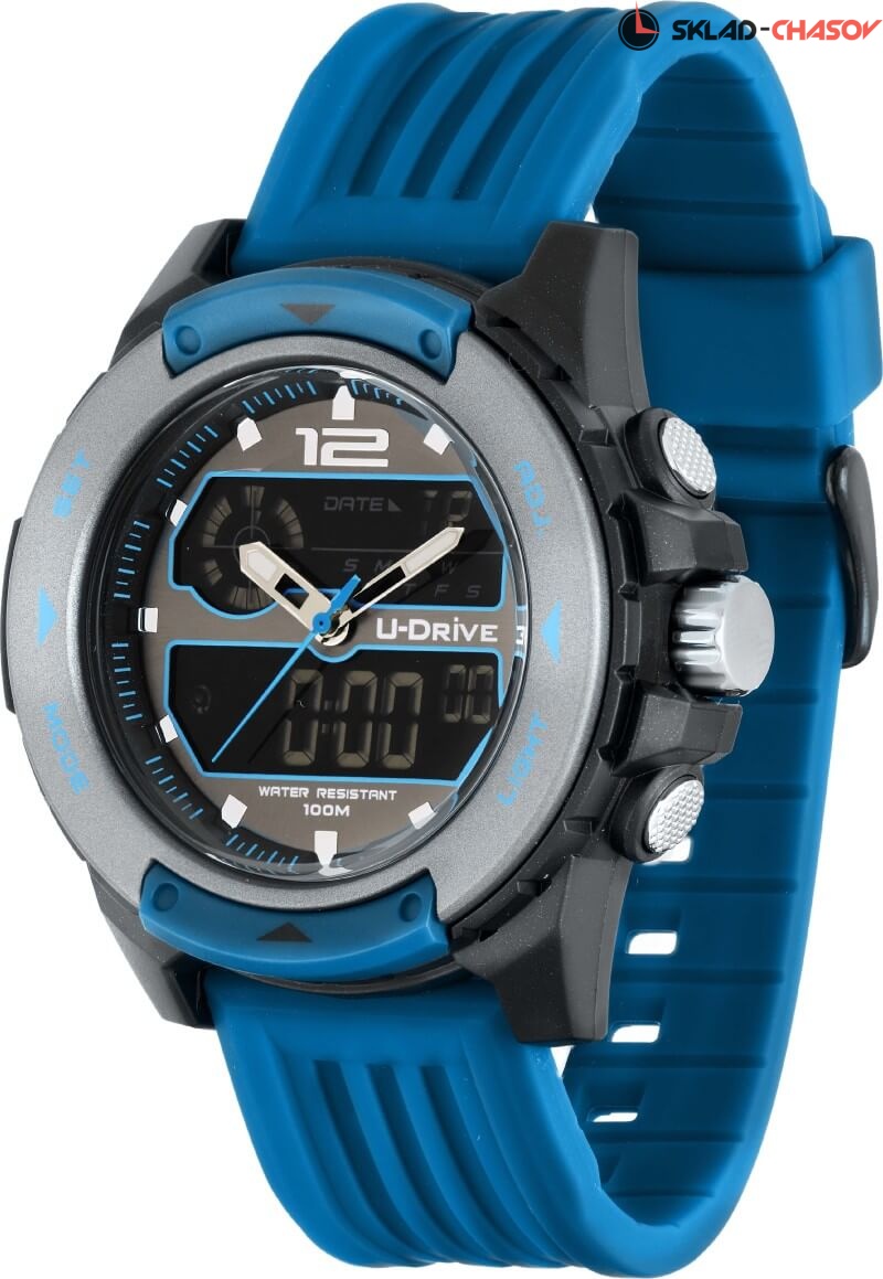 Часы U-Drive – надежный спутник активных и энергичных, тех, кто выбирает экстрим и свободу. Поэтому водостойкость модели повышенная — 10 атмосфер, а задняя крышка закреплена на винтах. В часах можно плавать и заниматься водными видами спорта. Во время тренировок, походов с палатками или в клуб, просто на прогулке с друзьями — часы U-Drive везде будут уместны. Их дизайн легко сочетается со спортивной формой или любой другой повседневной одеждой.