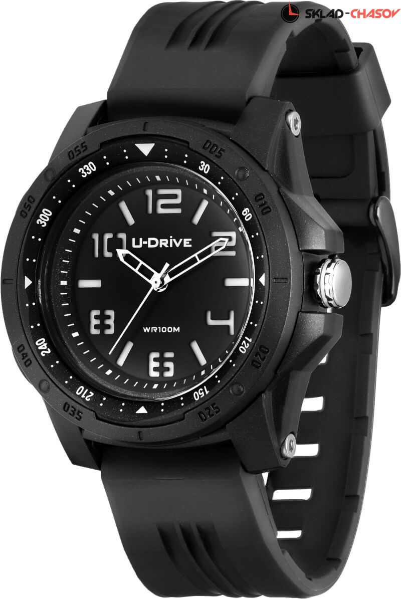 Часы U-Drive – надежный спутник активных и энергичных, тех, кто выбирает экстрим и свободу. Поэтому водостойкость модели повышенная — 10 атмосфер, а задняя крышка закреплена на винтах. В часах можно плавать и заниматься водными видами спорта. Во время тренировок, походов с палатками или в клуб, просто на прогулке с друзьями — часы U-Drive везде будут уместны. Их дизайн легко сочетается со спортивной формой или любой другой повседневной одеждой.