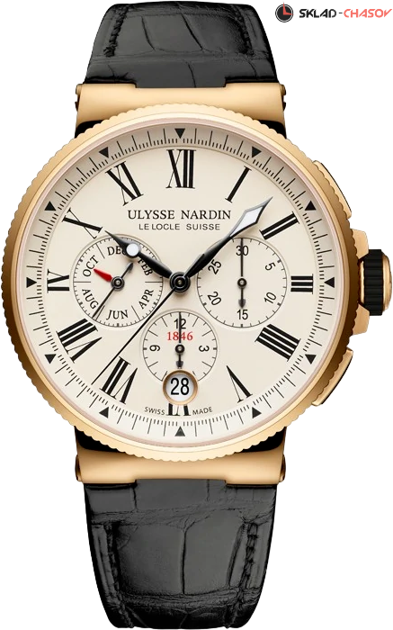 Marine Chronograph Annual Calendar с годовым календарем в корпус из розового золота с белым цветом циферблата и черным каучуковым ремешком, на безе нового мануфактурного калибра UN-153. Благодаря функции годового календаря, вы корректируете время один раз в год в Феврале. Указатель месяца с ярко-красной стрелкой совмещен с секундами в положении на 9 часов. 30-минутный счетчик хронографа находиться на 3 часа.