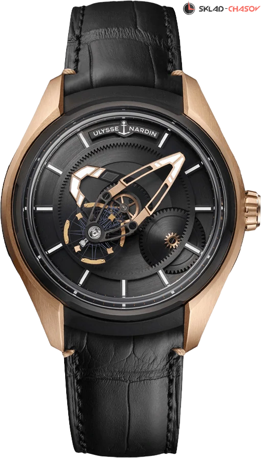 Часы представлены в золотом корпусе 750 пробы и титана с черной DLC обработкой. Внутри корпуса установлен автоматический механизм, Калибр UN-230, обладающий запасом хода 72 часа. На черном циферблате отображаются часы, минуты.