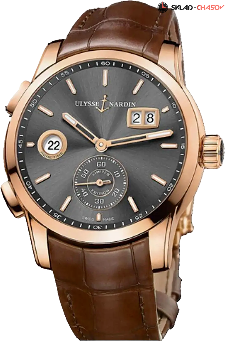 Корпус часов изготовлен золота 750 пробы.Вынесенная секундная стрелка на 6 часах, индикатор запаса хода на 3 часах, дата на 2 часах, на 9 часах индикация домашного времени. Лимитированная серия из 99 экземпляров.