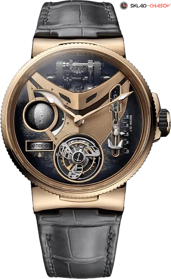 Эти часы отдают дань уважения морским стандартам, связанным с Ulysse Nardin и, по умолчанию, с Яхт-шоу в Монако. Все начинается с 44-миллиметрового корпуса из розового 18К золота, в котором находится не менее потрясающий парящий турбийон, оснащенный кареткой, смоделированной по образцу судового пропеллера последнего поколения. Этот шедевр механики украшен эмалевым циферблатом 3D Grand Feu, который имитирует нос корабля, пробивающегося сквозь волны океана. Индикатор запаса хода с цепочкой и якорем подключен к лебедке, которую вы видите в положении 12:00. Это похоже на судовую лебедку для якоря. Есть большая трехмерная фаза луны и индикатор приливных коэффициентов и объемов. Калибр UN-631 разработан собственными силами. Запас хода составляет 80 часов. Эта модель ограничена 30 экземплярами. Оснащены темно-синим ремешком из кожи аллигатора.