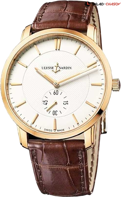 Ulysse Nardin Classico CLASSICO MANUAL WINDING Часы Ulysse Nardin Classico отличаются вынесенной на позицию 6-ти часов малой сеундной стрелкой. Корпус диаметром 39 мм изготовлен из розового золота 18к и обладает водонепроницаемостью до 50 метров. Внутри корпуса заключен мануфактурный механизм с ручным заводом и запасом хода 42 часа и функциями часов, минут и секунд. Часы являются официальным сертифицированным хронометром C.O.S.C. На белом гильошированном циферблате находятся центральные часовая и минутная стрелки, накладные золотые шевроны, надпись и логотип мануфактуры расположены в верхней части циферблата. Часы комплектуются коричневым ремешком из кожи аллигатора с застежкой из розового золота 18к.