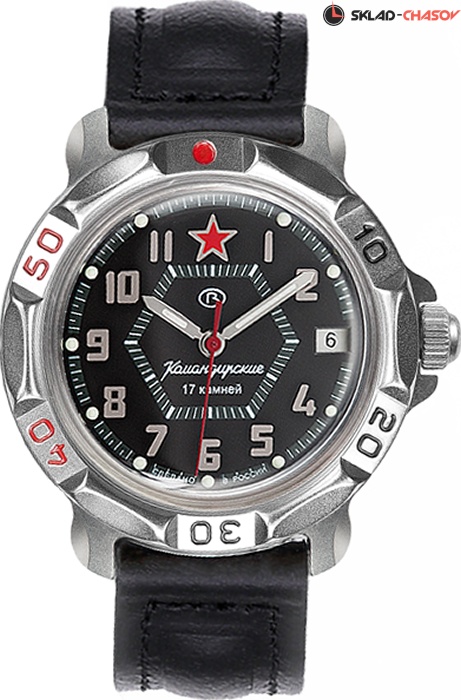 Мужские механические наручные часы Восток Командирские с красной звездой на месте 12-ти часовой отметки. Механизм Восток 2414А калибра 24 мм с центральной секундной стрелкой. В механизме 17 камней. Противоударное устройство узла баланса. Запас хода не менее 36 часов. титана. Циферблат закрывает выпуклое органическое стекло. На стрелки и часовые метки нанесен светонакопительный состав для возможности считывания времени в темноте. Поворачивающийся безель. Завинчивающаяся заводная головка с защитой. Корпус выполнен из часовой латуни с покрытием оксокарбонитридом Задняя крышка часов из нержавеющей стали. Ремешок из натуральной кожи с классической застежкой. Обхват запястья от 180 до 215 мм. (длина ремешка 75+115 мм). Гарантия 1 год. Функции: Число.