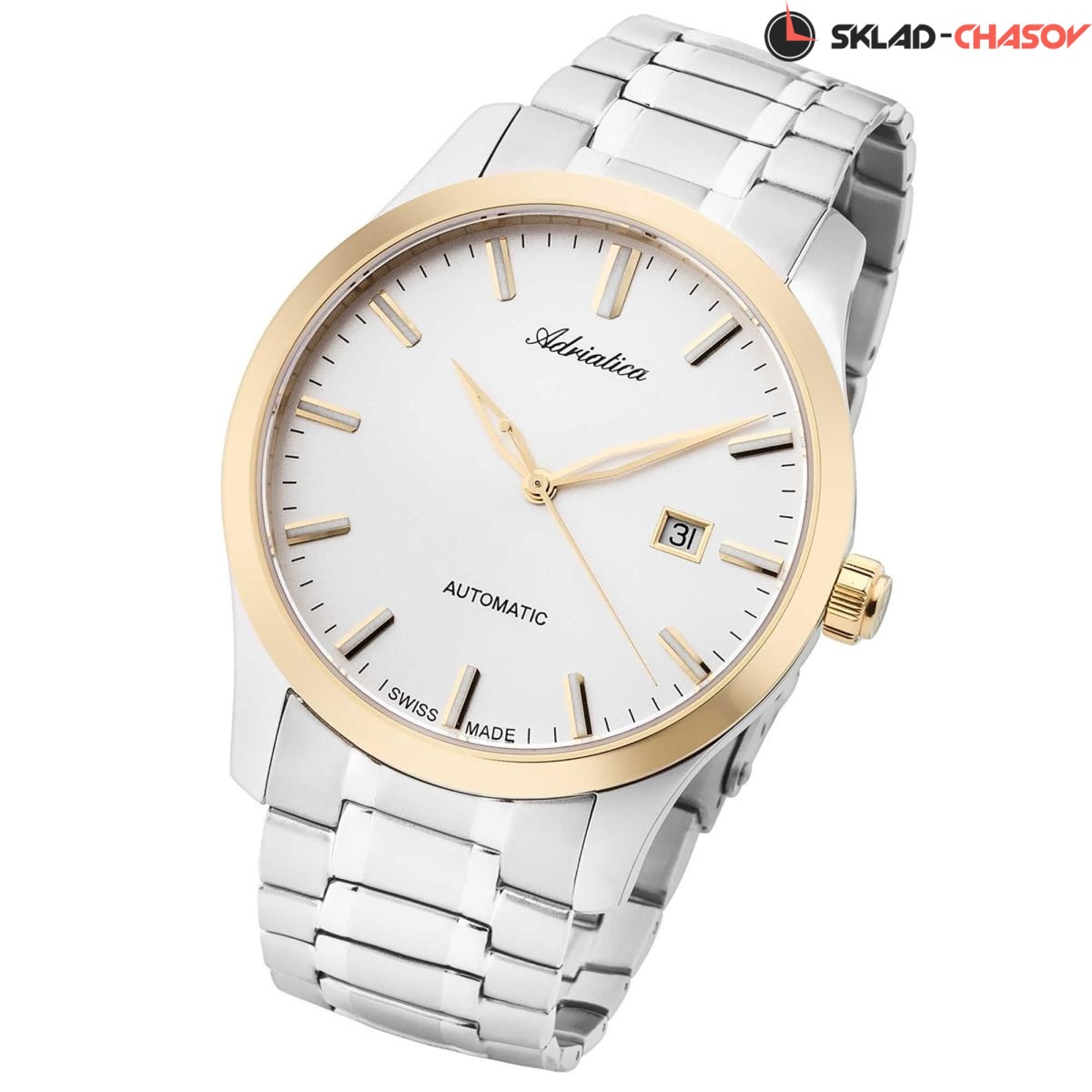Мужские механические часы Adriatica на стальном браслете. Механизм с автоподзаводом. На циферблате присутствует апертура текущей даты. Циферблат закрывает устойчивое к царапинам и потертостям сапфировое стекло. Вес 155 грамм. Гарантия 2 года.