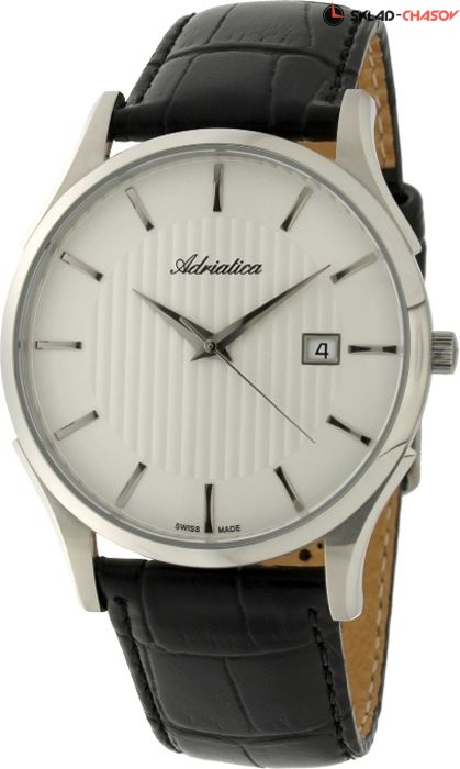 Классические мужские часы от швейцарского бренда Adriatica. На циферблате присутствует апертура текущей даты. Ремешок из натуральной кожи с классической застежкой. Точность хода обеспечивает швейцарский кварцевый механизм ETA F06. Вес часов 54 грамма. Гарантия 2 года.