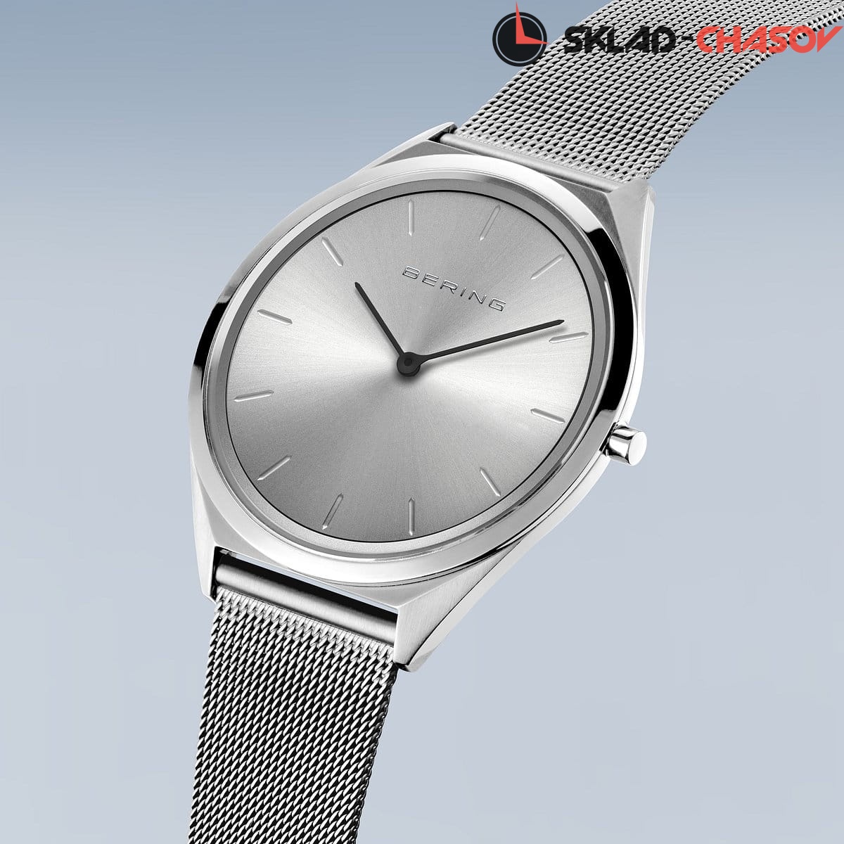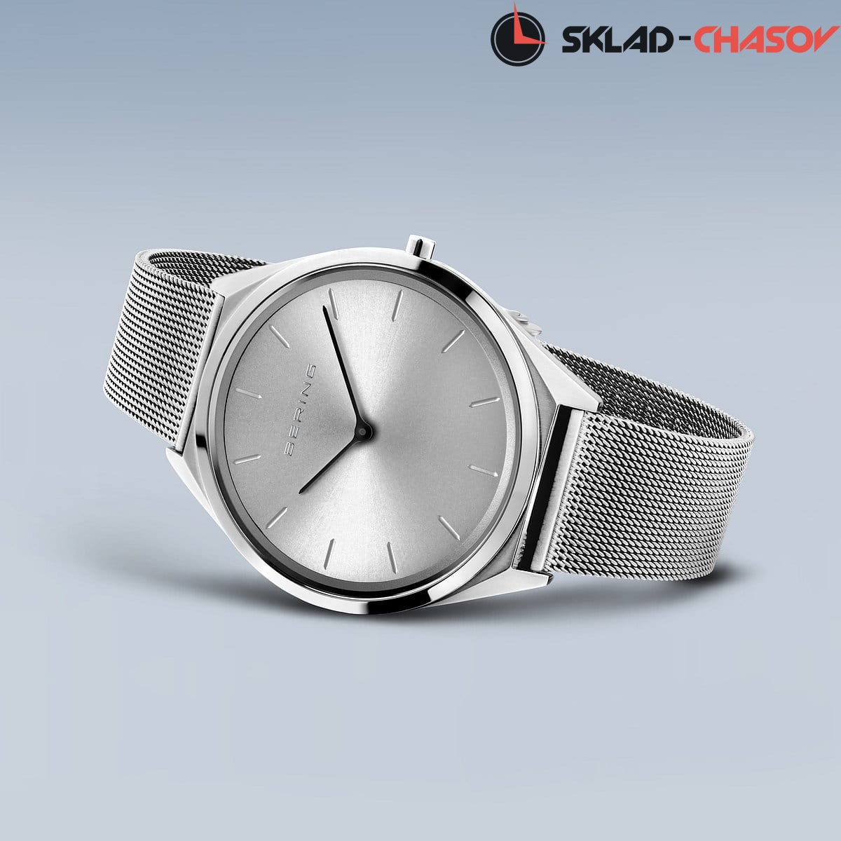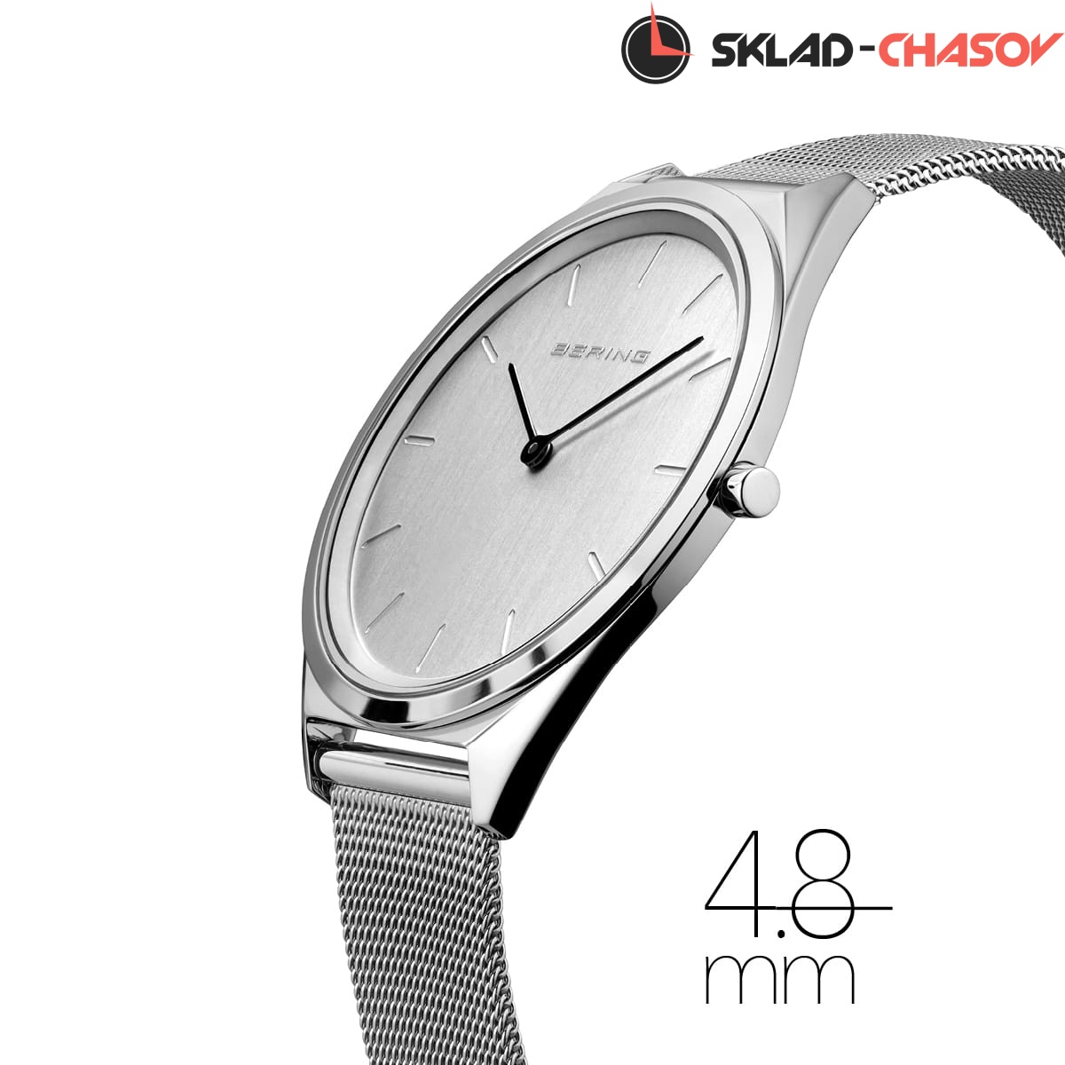 Ультратонкие мужские наручные часы Bering на стальном браслете миланского плетения. Гарантия 3 года.