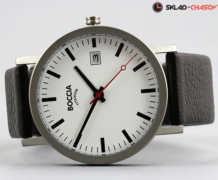 Мужские наручные часы Boccia с круглым титановым корпусом и черным кожаным ремешком. Присутствует апертура даты. Точность хода обеспечивает японский кварцевый механизм. Ремешок с классической застежкой. Вес часов всего 29 грамм. Гарантия 2 года.