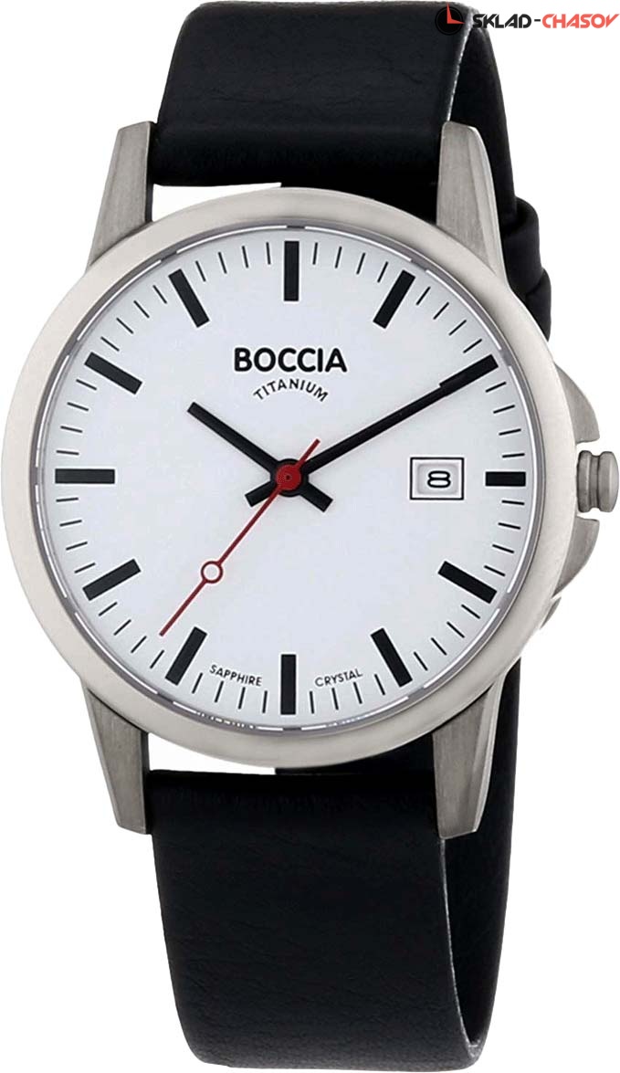 Мужские наручные часы Boccia с круглым титановым корпусом и черным кожаным ремешком. Присутствует апертура даты. Точность хода обеспечивает японский кварцевый механизм. Заводная головка с защитой. Ремешок с классической застежкой. Гарантия 2 года.