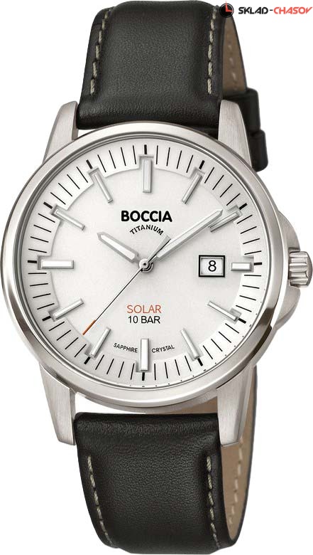 Мужские наручные часы Boccia с питанием от энергии солнечного света, не требующее замены батарейки. Присутствует апертура даты. На стрелки и часовые метки нанесен светонакопительный состав для возможности считывания времени в темноте. Завинчивающаяся титановая задняя крышка. Заводная головка с защитой. Ремешок с классической застежкой. Гарантия 2 года.