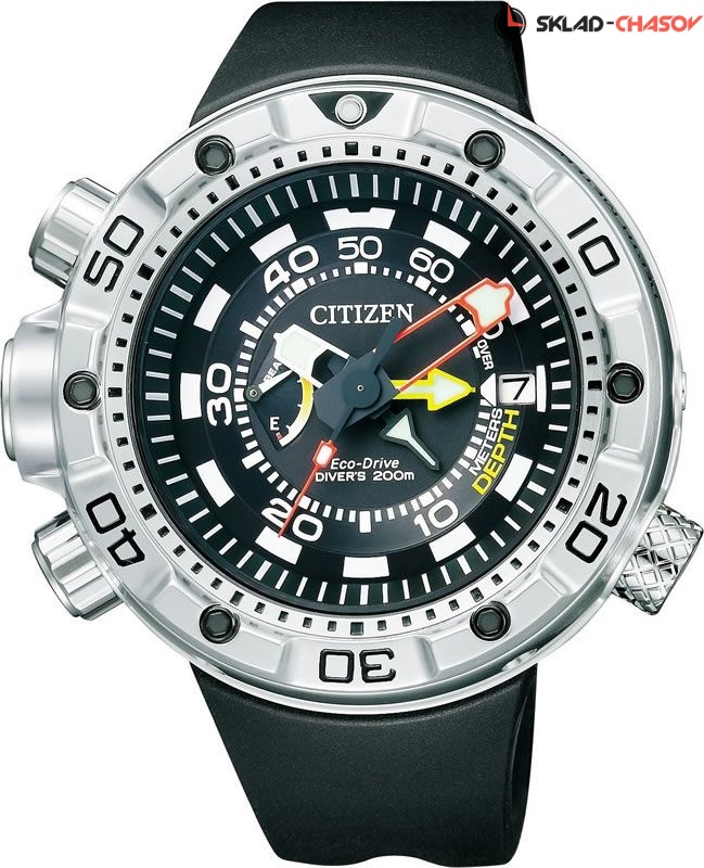 Сертифицированные часы для дайвинга (ISO 6425). Система Eco-Drive, не требующая замены батарейки. Питание от солнечной энергии, запас энергии на 330 дней. Ретроградный указатель запаса хода. Глубиномер. Память максимальной глубины погружения. Сигнализация декомпрессии - подается звуковой сигнал при превышении заданной скорости всплытия. Защищены от магнитных полей. Безель вращается в одном направлении. Завинчивающиеся заводная головка и задняя крышка. Вес: 178 г. Гарантия 1 год.