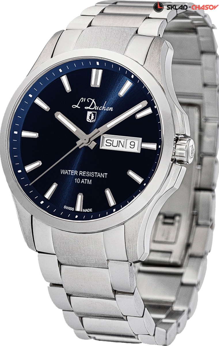 Классические часы со спортивным характером – перед вами новая модель серии Dynamique в кварцевым механизмом Ronda. Ее корпус сделан из нержавеющей стали с гипоаллергенными свойствами. Матирование подчеркивает сложную конструкцию корпуса, в которой предусмотрена дополнительная защита для рельефной заводной головки. Синий циферблат украшен полировкой в виде солнечных лучей, исходящих из центра. Стрелки часов и минут и риски с люминесцентным покрытием позволяют легко определить время даже в темноте. Окошко даты и дня недели визуально выделено стальной окантовкой. Циферблат часов защищен сапфировым стеклом. Повышенная водостойкость составляет 10 атмосфер. Браслет модели состоит из литых стальных звеньев, на него установлена удобная в использовании застежка-клипса с логотипом бренда L’Duchen. Эти часы – надежный и стильный аксессуар, который будет уместен в любой ситуации: и на деловой встрече, и на дружеской вечеринке.