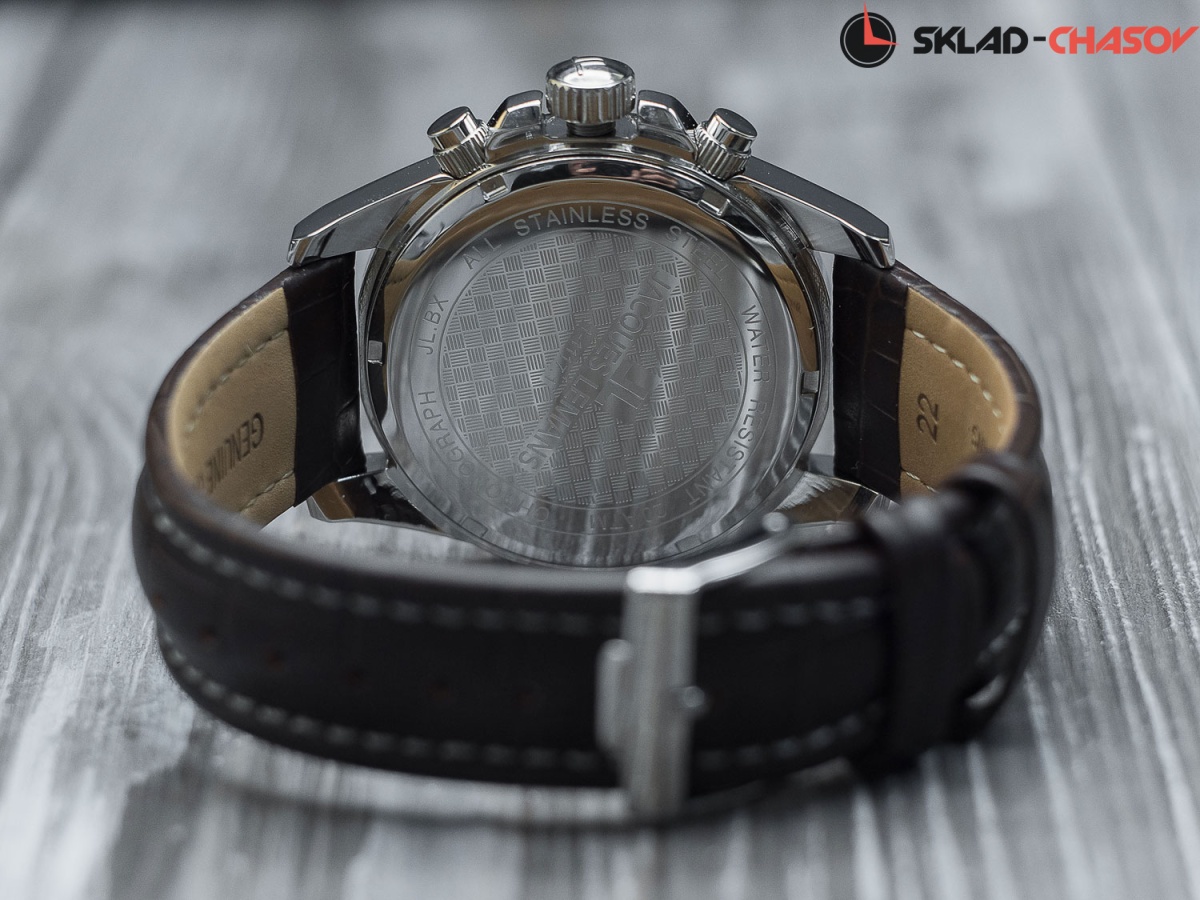 Механизм Miyota калибр FS20. Смещенная секундная стрелка (положение 6 часов). Окошко даты. Суточный индикатор (1-24 часа) в положении 3 часа. Центральная стрелка хронографа и минутный накопитель в положении 9 часов. Доступный режим измерения ADD. Максимальное время измерения 59 минут 59 секунд. • Точность хода не хуже -/+ 20 сек./в месяц. • Элемент питания SR626SW. Срок службы батареи 24 месяца. • Выпуклое минеральное стекло устойчивое к возникновению царапин. • Светонакопительный состав на стрелках и маркерах часа. • Корпус из высококачественного стального сплава 316L с высокими антикоррозийными свойствами. • Водозащита до 20 АТМ. • Кожаный ремешок с водоотталкивающей пропиткой.