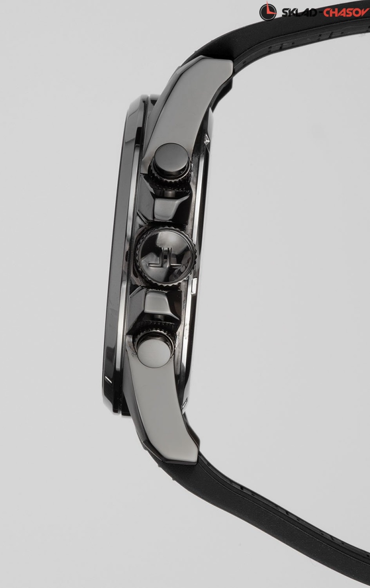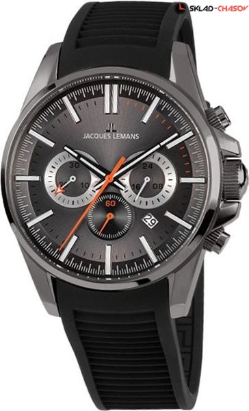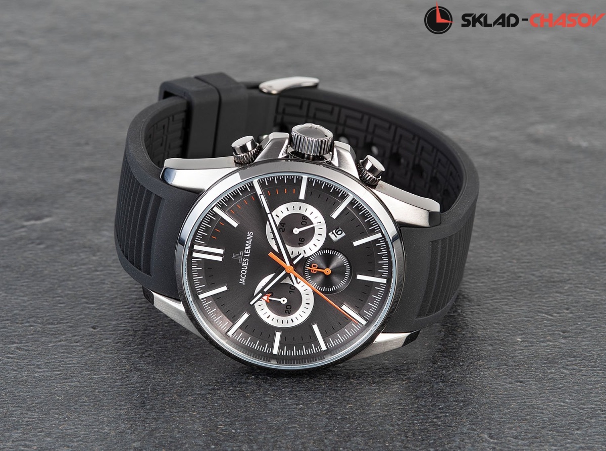 Часы Жак Леман из коллекции Liverpool яркий спортивный хронограф. Корпус выполнен из высококачественной легированной стали. На циферблате ярко выделяется секундная стрелка. Стальные риски чередуются с арабскими цифрами, указывающие часы, дополнительно выделены индексы минут. На часовую и минутную стрелки нанесено люминесцентное покрытие, которое позволяет определять время даже в темноте. Хронограф оснащен накопителями на 24 часа, 30 минут и счетчиком секунд. Окно даты расположено между 4 и 5 часами. Кварцевый механизм обеспечивает точность хода, минеральное стекло усилено напылением Crystex. Модель оснащена спортивным ремнем из силикона. Силиконовые ремни идеальны для спорта, они эргономичны, гипоалллергенны и надежны. Герметичность до 10 АТМ дает Вам возможность использовать часы в различных условиях.