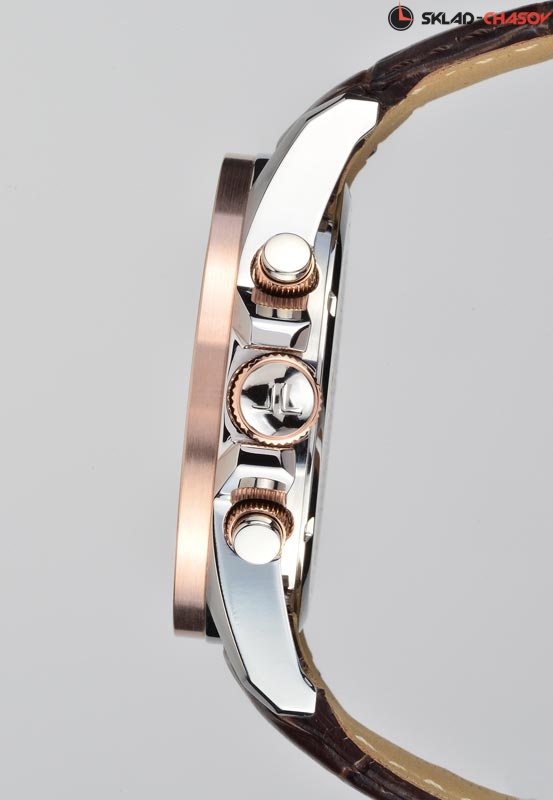 • Стойкое IP-покрытие цвета золота на безеле, элементах и переводной коронки и кнопок хронографа.