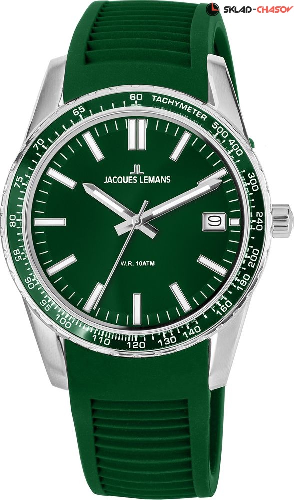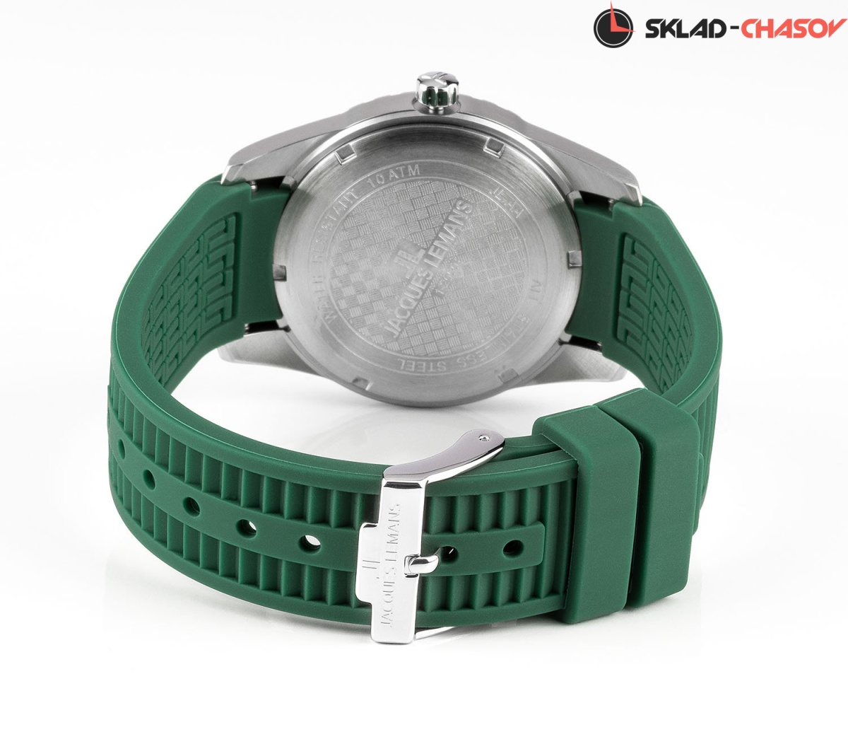 Кварцевые часы от Jacques Lemans сделаны с учетом последних модных тенденций. Корпус из нержавеющей стали имеет универсальный диаметр 39 мм. На циферблате зеленого цвета выделены хорошо читаемые риски и дополнительный индикатор даты. Ударопрочное минеральное стекло Crystex надежно защищает циферблат от внешних воздействий. Задняя крышка оснащена резьбой для более плотного прилегания — это необходимо при повышенной водостойкости 10 атмосфер. Зеленый ремешок сделан из силикона — современного материала, среди преимуществ которого мягкость и, одновременно, прочность. Он также не боится повышенной влажности, надолго сохраняет первоначальный вид даже при ежедневном использовании. Дизайн этих часов позволяет легко сочетать их c одеждой практически любого стиля и направления.