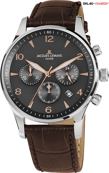 Кварцевый хронограф. Смещенная секундная стрелка (положение 6 часов). Окошко даты. Суточный индикатор (1-24 часа) в положении 3 часа. Центральная стрелка хронографа и минутный накопитель в положении 9 часов. Максимальное время измерения 39 минут 59 секунд. • Точность хода не хуже -/+ 20 сек./в месяц. • Минеральное стекло устойчивое к возникновению царапин. • Корпус из высококачественного стального сплава 316L с высокими антикоррозийными свойствами. • Водозащита до 10 АТМ. • Кожаный ремешок. • Диаметр корпуса 40 мм.