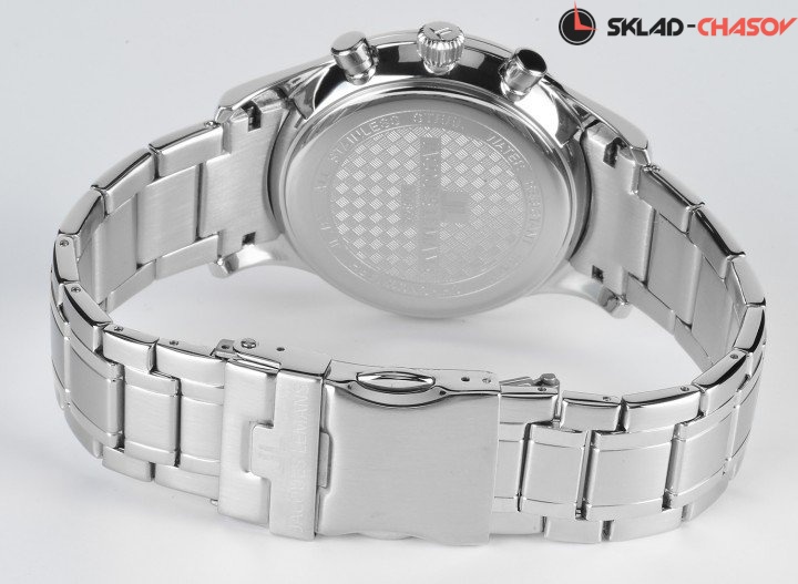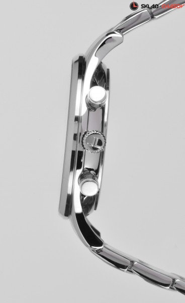 Точный кварцевый механизм хронографа. Смещенная секундная стрелка. Окошко даты. • Точность хода не хуже -10 +15 сек./в месяц. • Минеральное стекло устойчивое к возникновению царапин. • Корпус из высококачественного стального сплава 316L с высокими антикоррозийными свойствами. • Регулируемый по длине браслет из нержавеющей стали. • Водозащита до 10 АТМ. • Тахометрическая шкала.