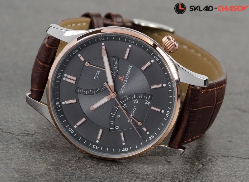 Точный кварцевый механизм. Центральная секундная стрелка. • Точность хода не хуже от -10 до +20 сек. в месяц. • Ретроградный указатель даты. • Ретроградный указатель двойного часового пояса в 24-х часовом формате времени.