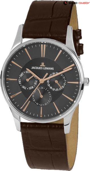 Современные многофункциональные часы в круглом корпусе из прочной нержавеющей стали диаметром 40 мм. На объемном циферблате серого цвета расположены дополнительные индикаторы даты, дня недели и 24-х часов. Они визуально выделены полировкой в виде солнечных лучей – это смотрится эффектно и помогает легко читать нужные показатели. В часах с кварцевым механизмом установлено ударопрочное минеральное стекло Crystex. Темно-коричневый ремешок сделан из мягкой натуральной кожи и дополнен застежкой – пряжкой с логотипом бренда. Надежные и функциональные, эти часы хорошо подходят для ежедневного использования, они украсят любой ваш образ: деловой или в стиле casual.