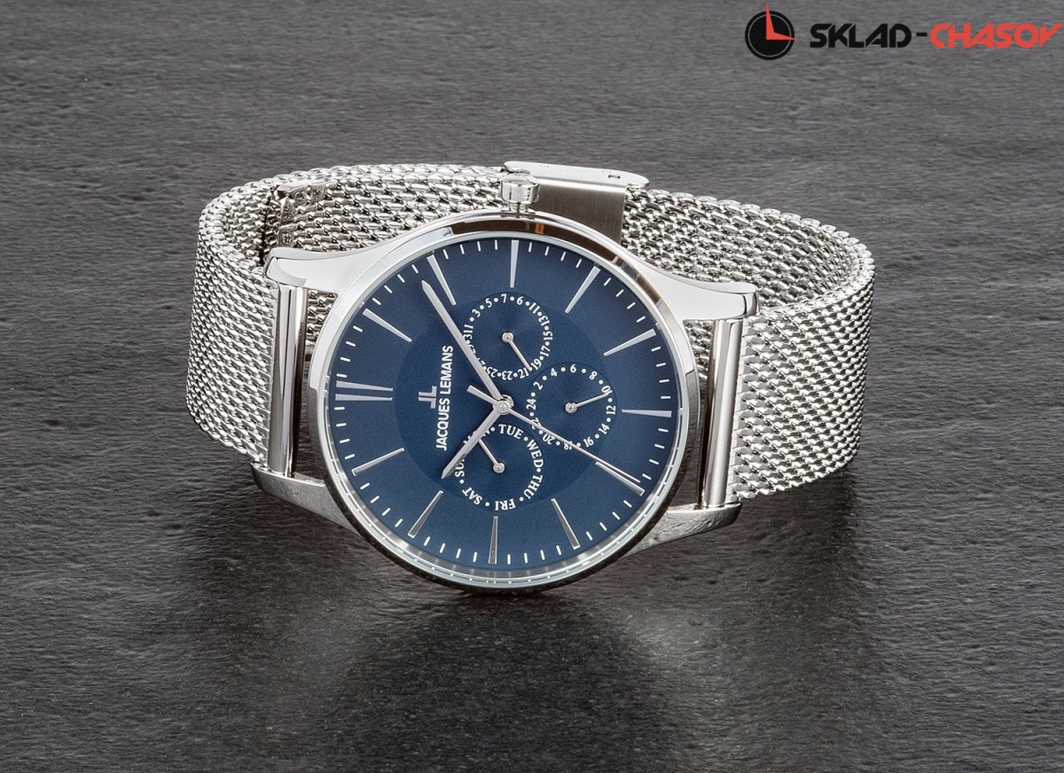 Современные многофункциональные часы в круглом корпусе из прочной нержавеющей стали диаметром 40 мм. На объемном циферблате темно-синего цвета расположены дополнительные индикаторы даты, дня недели и 24-х часов. Они визуально выделены полировкой в виде солнечных лучей – это смотрится эффектно и помогает легко читать нужные показатели. В часах с кварцевым механизмом установлено ударопрочное минеральное стекло Crystex. Стальной ремешок модного миланского плетения дополняет специальная «плавающая» застежка. Она позволяет самостоятельно регулировать длину браслета. Надежные и функциональные, эти часы хорошо подходят для ежедневного использования, они украсят любой ваш образ: деловой или в стиле casual.