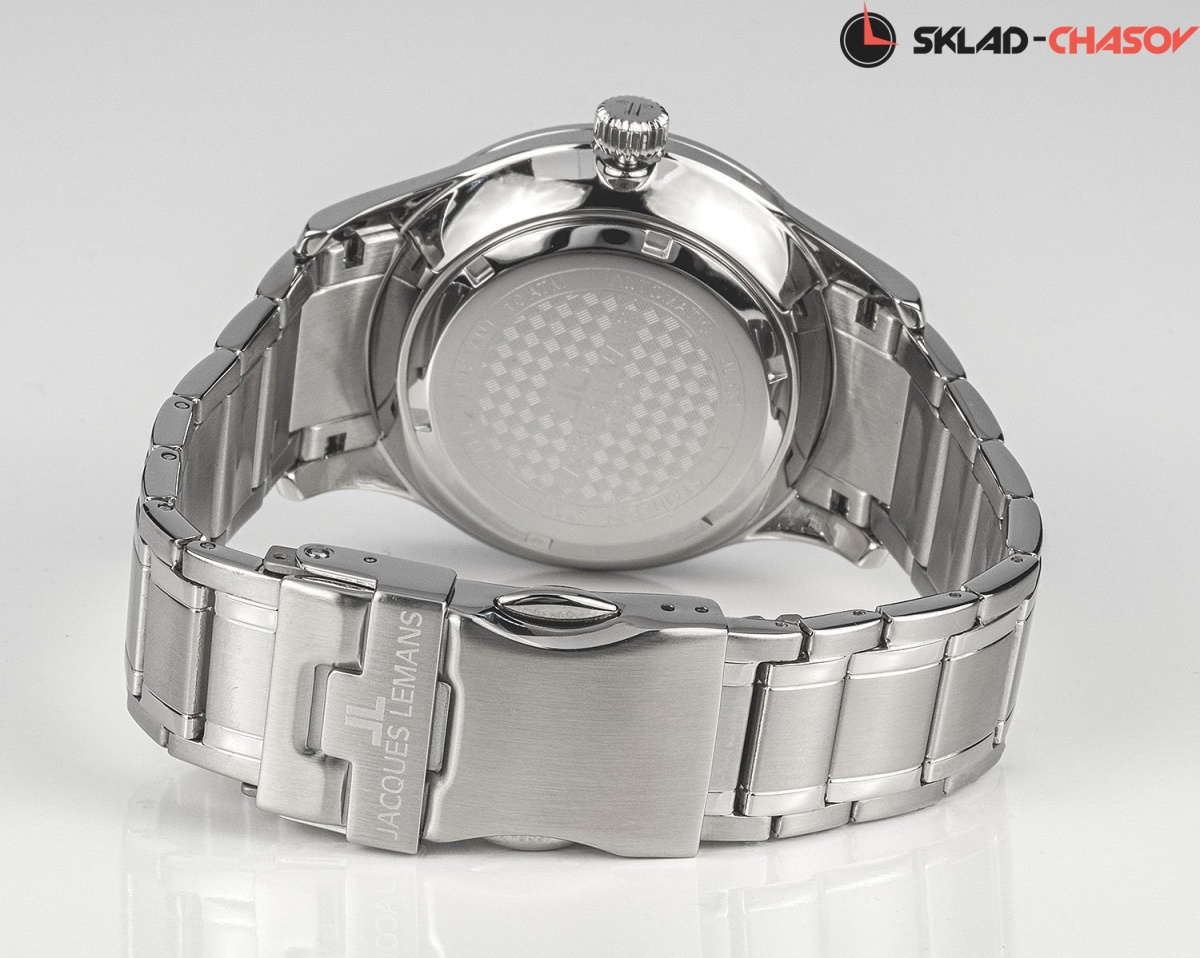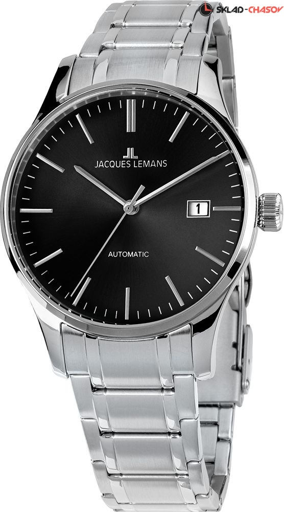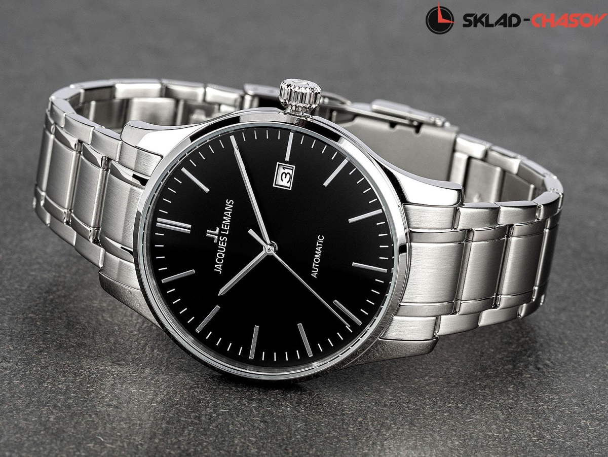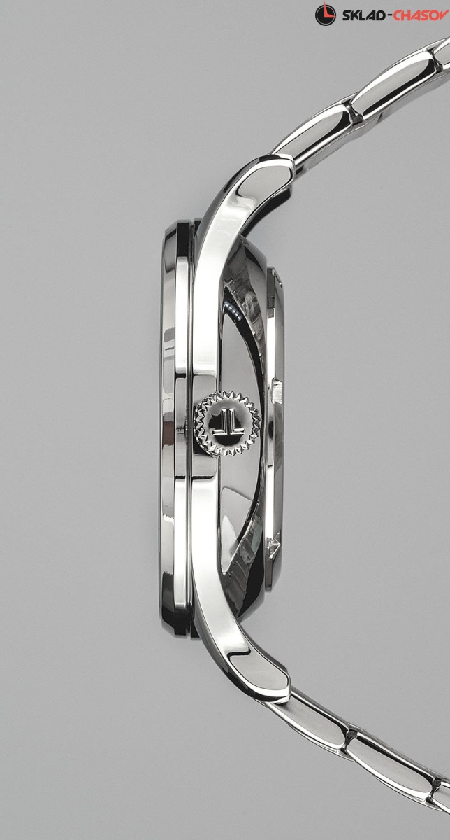 Механический калибр с автоподзаводом. Центральная секундная стрелка. Окошко даты. Точность хода не хуже -15...+25 сек. в сутки. На черном полированном циферблате размещены контрастные риски, в позиции «3 часа» - дополнительный индикатор даты. Корпус диаметром 40 мм сделан из прочной нержавеющей стали. В модели установлено ударопрочное минеральное стекло Crystex. Водостойкость составляет 10 атмосфер. Браслет собран из литых стальных звеньев с надежной раскладывающейся застежкой-клипсой.