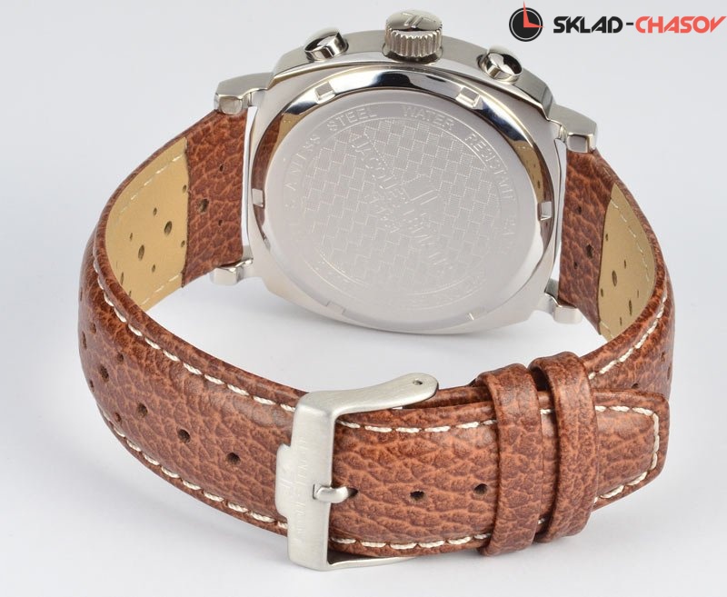 • Японский кварцевый механизм. • Точность хода с погрешностью не более -/+20 сек. в месяц. • Центральные часовая и минутная стрелки, маленький секундный индикатор. • Апертура даты. • Индикатор времени суток в 24-часовом формате. • Хронограф с центральной секундной стрелкой и 60-минутным индикатором. • Корпус выполнен из нержавеющей стали 316L, поверхности с матовой шлифовкой (сатинирование) и полировкой до зеркального блеска. • Ширина/высота (без учета дужек) корпуса 40 мм. • Фирменное минеральное стекло с покрытием Crystex с повышенной стойкостью к возникновению царапин. • Рельефный циферблат, аппликация часовых меток и элементов дизайна с покрытием цвета золота. • Водостойкость 100 метров (10 АТМ). • Кожаный ремешок с перфорацией, стандартная застежка с шипом.