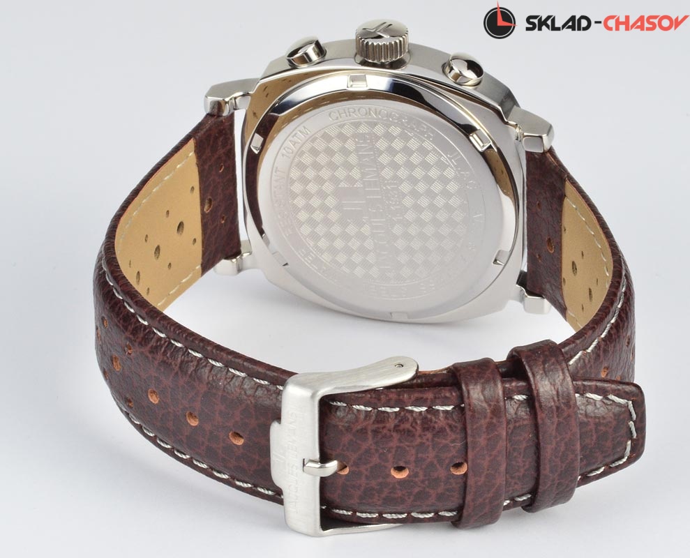 • Японский кварцевый механизм. • Точность хода с погрешностью не более -/+20 сек. в месяц. • Центральные часовая и минутная стрелки, маленький секундный индикатор. • Апертура даты. • Индикатор времени суток в 24-часовом формате. • Хронограф с центральной секундной стрелкой и 60-минутным индикатором. • Корпус выполнен из нержавеющей стали 316L, поверхности с матовой шлифовкой (сатинирование) и полировкой до зеркального блеска. • Ширина/высота (без учета дужек) корпуса 40 мм. • Фирменное минеральное стекло с покрытием Crystex с повышенной стойкостью к возникновению царапин. • Рельефный циферблат, аппликация часовых меток и элементов дизайна с покрытием цвета золота. • Водостойкость 100 метров (10 АТМ). • Кожаный ремешок с перфорацией, стандартная застежка с шипом.