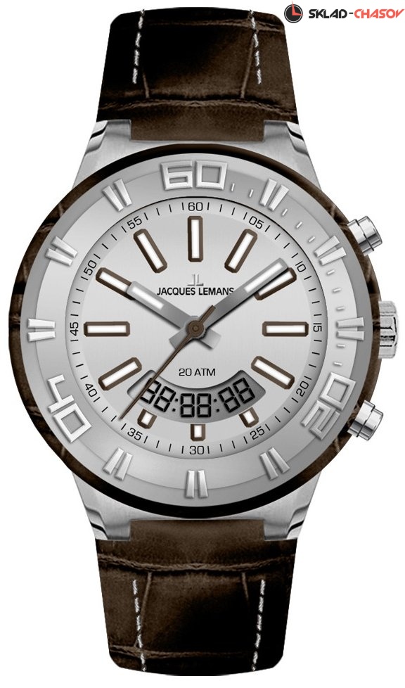 Крупный корпус диаметром 45 мм выполнен из высококачественной легированной стали. Широкий безель обрамлен кожаным кольцом. Циферблат подчеркивают крупные люминесцентные риски и стрелки, а также окно с цифровой индикацией даты. В часах установлен кварцевый механизм, ударопрочное стекло Crystex и ремень из натуральной кожи. В часах можно плавать и нырять благодаря герметичности 20 АТМ. Спортивная модель часов Жак Леман — для активных людей.