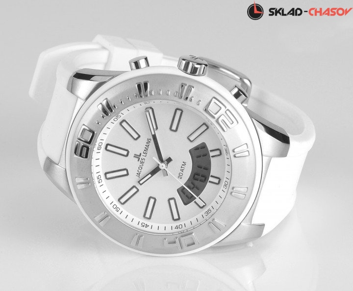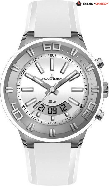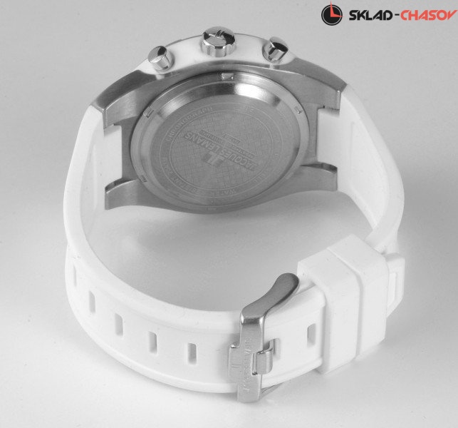 Эффектные, многофункциональные часы для спорта. Мужские наручные часы в круглом корпусе из коллекции Miami. Диаметр корпуса 45 мм. Корпус часов выполнен из высоколегированной полированной стали с частичным PVD-покрытием белого цвета. Часы оснащены ремешком из каучука белого цвета. Ремешок не промокает, очень эластичен, долговечен. Крепление ремешка к корпусу жесткое. Циферблат защищен от повреждений прочным минеральным стеклом. Данная модель имеет водозащиту класса WR200. Белый циферблат с длинными маркерами часа и электронным календарем - число, месяц, год. Крупные основные стрелки. Центральная секундная стрелка. Стрелки и метки с люминесцентным составом. Светодиодная подсветка. В сердце модели работает точный кварцевый механизм хронографа, который обладает высокой точностью хода, более устойчив к внешним воздействиям и не требует дополнительного завода. Точность хода не хуже -10 +15 сек./в месяц.